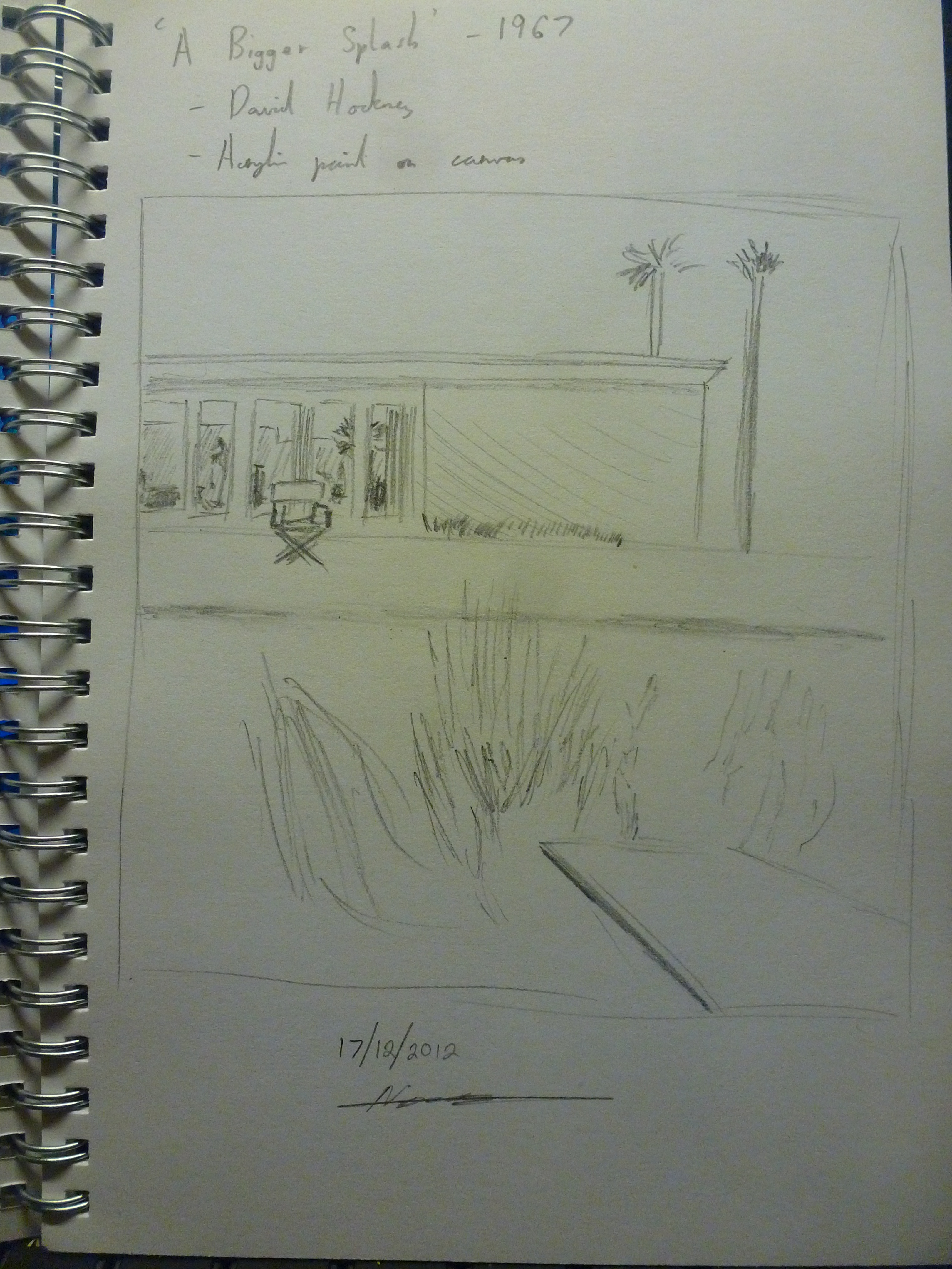 Upon entering the first room, one could easily tell they hadn’t given much thought about first impressions and really giving that ‘splash’ to excite the viewers. To the left of the entrance was Jackson Pollock’s Summertime: Number 9A 1948, enclosed in a glass display case, laid flat on a raised, white platform, just like how Pollock would have originally laid it during painting. Suspended on the wall next to it was a film showing Pollock making his Abstract Expressionist paintings. On the wall opposite hung Hockney’s A Bigger Splash 1967, with a short film based on it displayed on a screen nearby. These works barely filled the room.