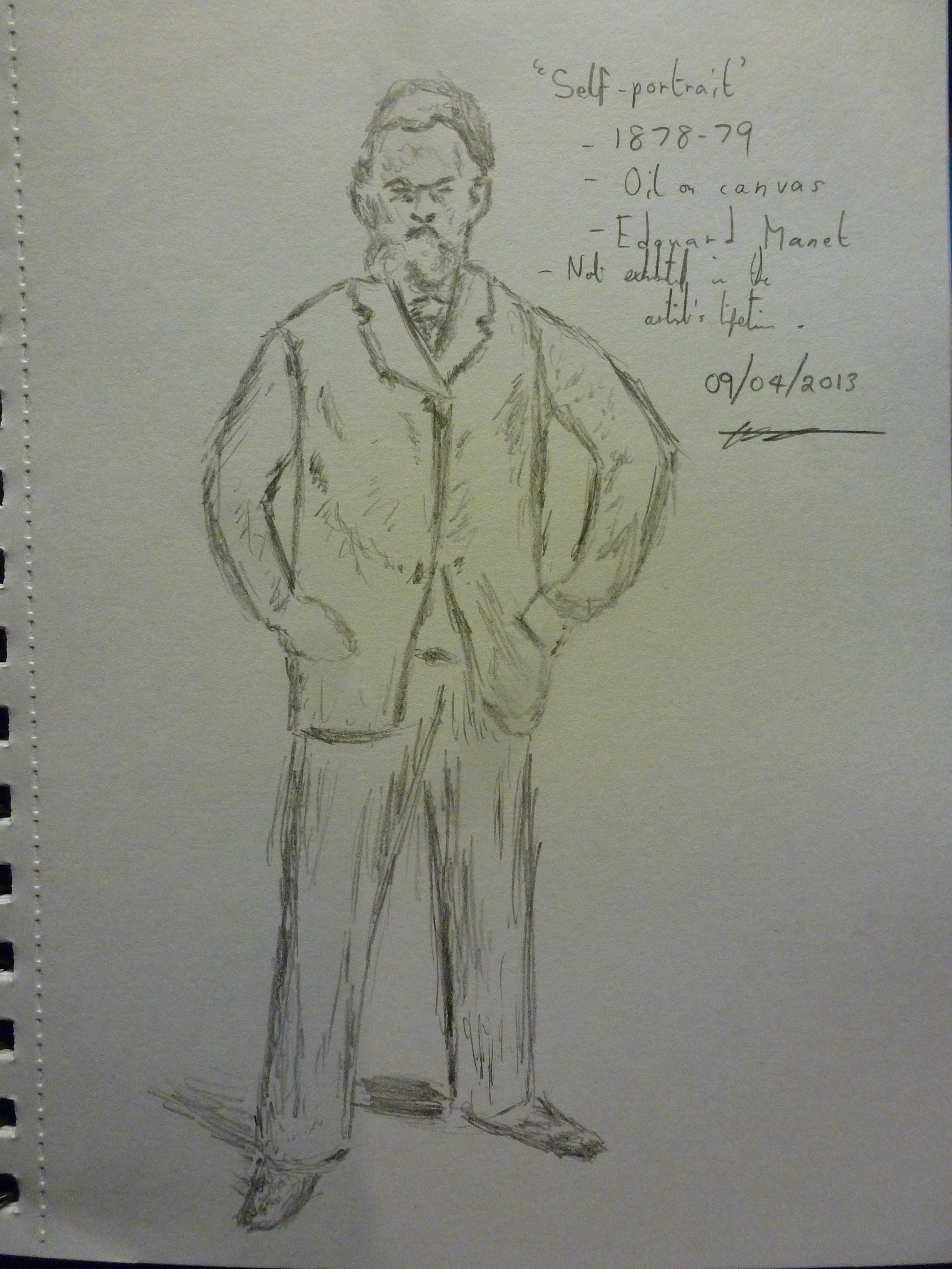 The main thing I took away from the exhibition, however, was that Manet tried to portray his subjects in a modest manner. In his Portrait of Eva Gonzalès (c. 1879) he wanted to emphasise her beauty. Here I quote from the painting’s caption: “[the painting] functions more as a fashion plate, her looks suiting Manet’s penchant for depicting attractive women in pastel at the end of his career.” It is also interesting to note that this painting is much softer in its rendering than any of the other exhibited works. In Portrait of Lise Campineanu (1878) the artist depicts a little girl in an expensive blue dress, hinting at her social status. But her casual pose and innocent look reminds us that she is still just a child. Manet does a really good job of this, which makes him suitable as a Realist painter, regardless of his loose Impressionist style. Furthermore, his sitters are depicted as being exempt from their professions, such as in The Artist: Portrait of Marcellin Desboutin (1875) and even his Self-portrait (1878-79), one of only two independent self-portraits of the artist.