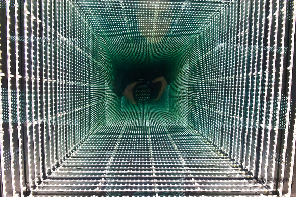 The next gallery room welcomed us with a rather nifty little piece involving a light bulb and its reflection. Entitled Bulb Box Reflection II (1975), Bill Culbert presents us with an unlit light bulb whose reflection depicts a lit light bulb. Creepy, eh? Even weirder is that the mirror functions perfectly as a normal mirror. My assumption is that he used a one-way mirror, since they are transparent enough to let light through, as was obvious in Iván Navarro’s Reality Show (Silver) (2010) and Burden (Lotte World Tower) (2011) shown in the gallery upstairs. One thing about Navarro’s work is that he likes to play with endless reflections, creating the illusion of neverending spaces.