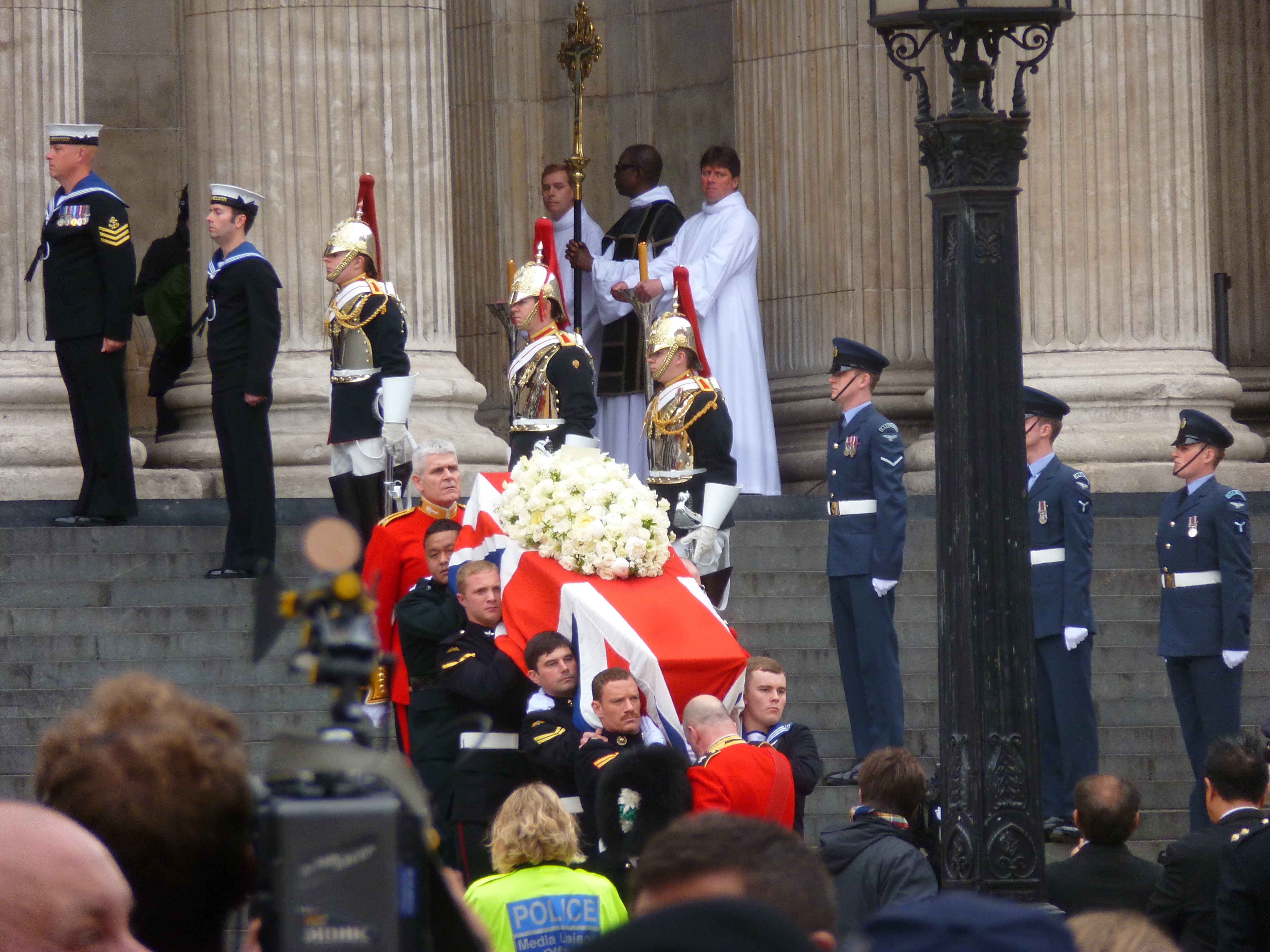 Baroness Margaret Thatcher’s coffin being lifted out of St Paul’s Cathedral. Own photograph.