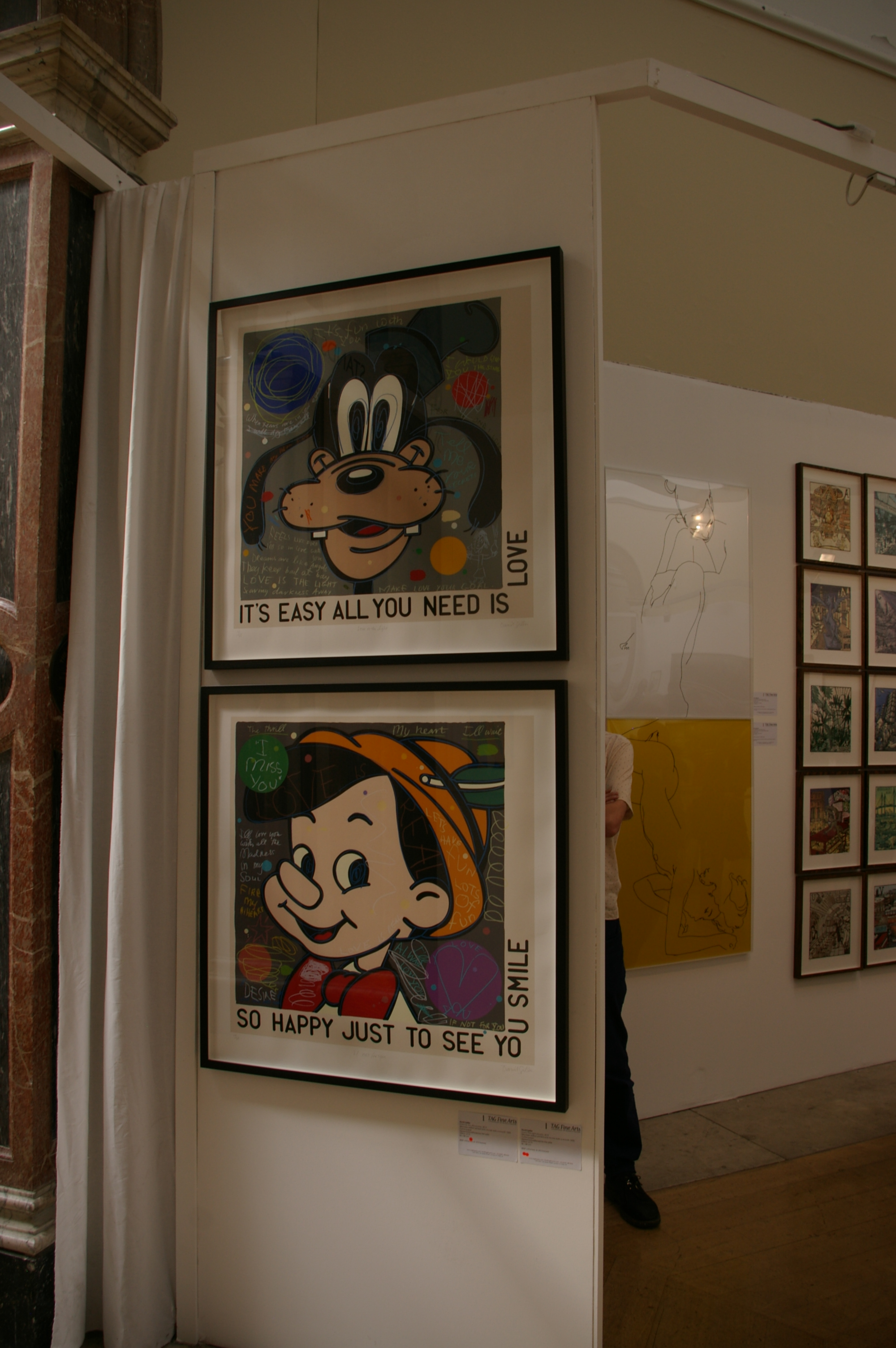 The fair circulates in a clockwise direction, though Liliana and I went the wrong way. Fortunately, the entrance was also the exit, and the fair was of a circulating type. Anyway, as soon as we entered, to our immediate left were a series of Bridget Riley prints exhibiting at Karsten Schubert. In front was TAG Fine Arts, selling a variety of prints such as David Spiller’s Love is the Light (Goofy) and a very interesting photogravure etching by Stephen Walter entitled Cyclesea (2013), selling for £1,100 unframed. Emanuel von Baeyer was the 3rd gallery accommodating the Central Hall, selling mainly 17th-19th century prints such as those of Christopher Le Brun, yet I was also able to find several Lucian Freuds.