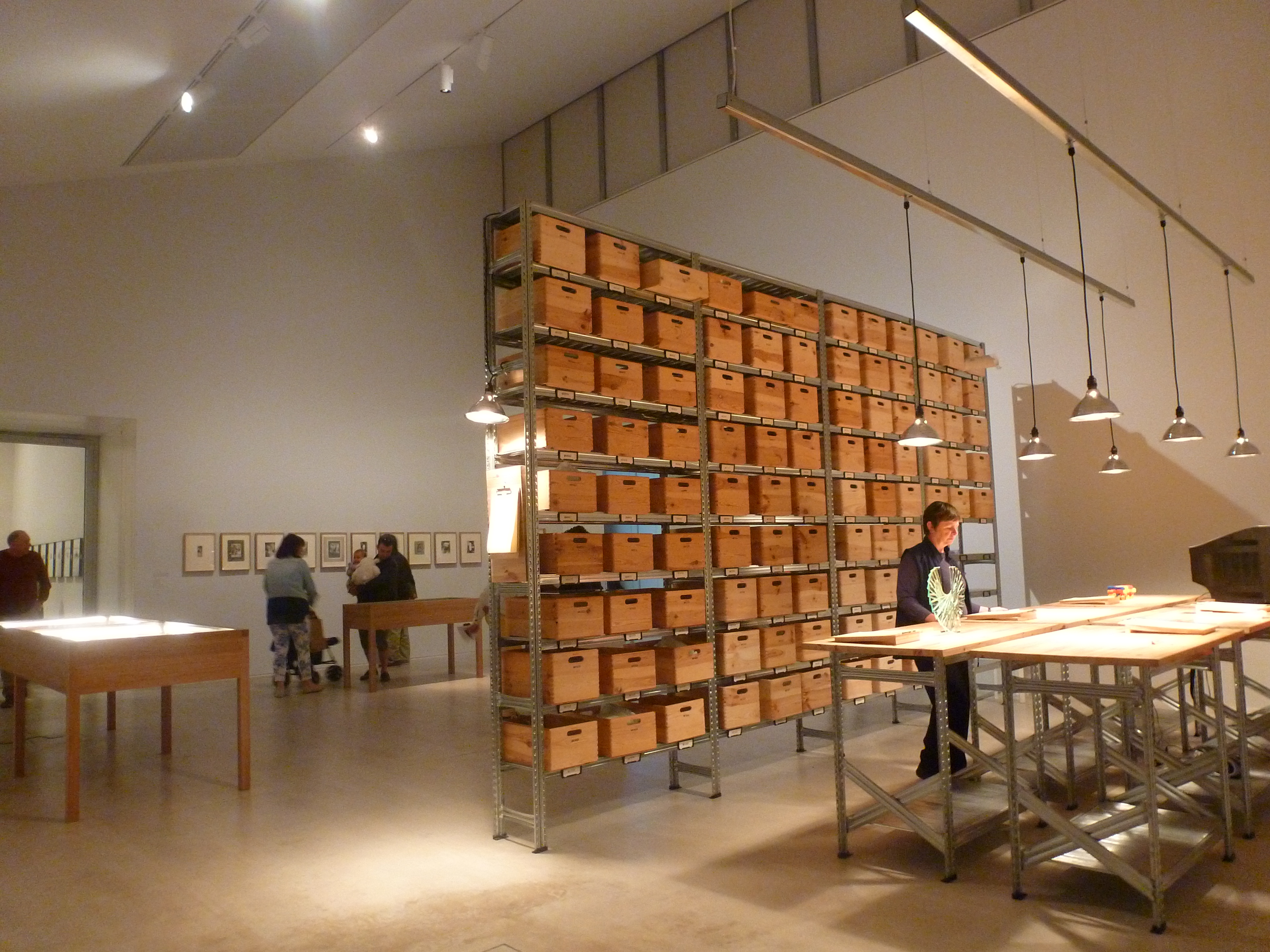 Pass through a set of glass double doors and you enter a room that might remind you of a half-lit warehouse. The main source of light comes from an installation entitled Assembly (Curiosity) (1992-ongoing) by the artist group Agency. The setup is simple: several wooden tables, each with a specimen object – or as they like to call it: ‘things’ – a document, and a large shelf containing wooden boxes of other ‘things’. Each document is a report detailing the complaints and court cases filed against their respective object, all of which are classed as intellectual property. Furthermore, each specimen prompts the question: “How can processes and systems become included within art practices?”