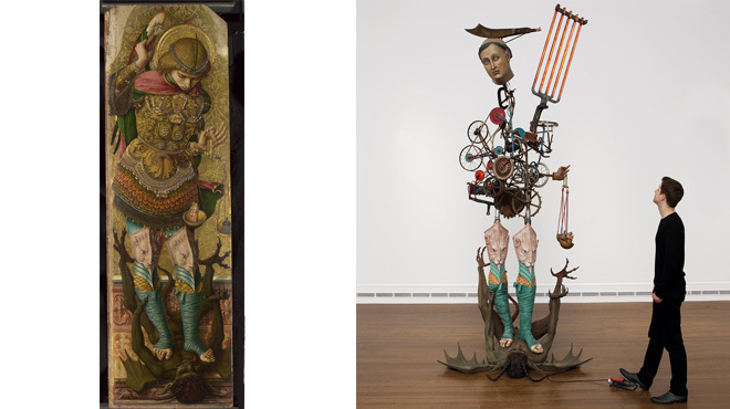 Carlo Crivelli, Saint Michael, about 1476 (left); Michael Landy, Multi-Saint, 2013 (right). Image via www.timeout.com.