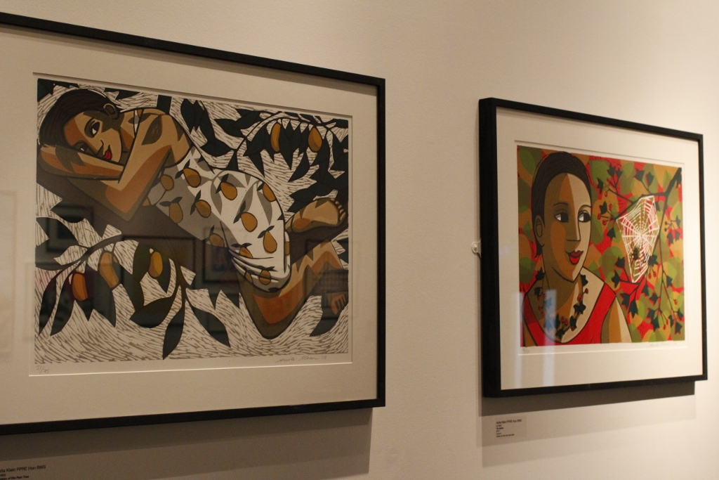 For figurative art there is a concentrated display of prints by Eileen Cooper, Anita Klein and Ana Maria Pacheco. These prints have a particular focus on women with the first two often incorporating the same figure in a large body of work. Cooper’s linocuts tend to be psychological at first glance – some might say surreal, others even Freudian. Their content is a mix between fantasy and reality with titles like The Moon, The Bird and The Bride (1992) and Walking on Air (2005). Her recurring figure is a naked woman. Klein, on the other hand, uses a clothed figure. Her themes often revolve around the idea of beauty in art and everyday life such as nature, romance, family and birds. The prints displayed in the exhibition – The Goddess of the Pear Tree (2013) and The Spider (2013) – are part of the former category. In an interview in 2011, Klein said that she “grew up with a very strong sense of possibility of everything being taken away…I know that what I would miss are the very small things like having breakfast with my family, cleaning our teeth together… not holidays or birthdays or the photo-album version of life. Not the things we record but things that go past, slip through our fingers, things we don’t manage to enjoy” [full interview HERE] It is in the ordinary in which we find the most happiness and create the most memories.