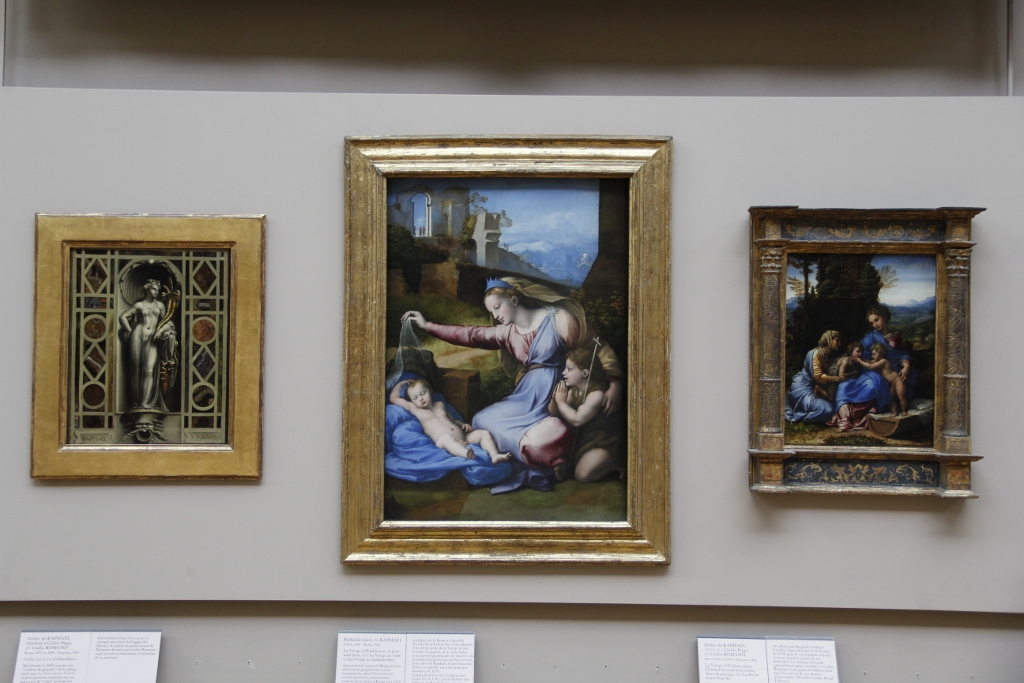 I showed them Raphael’s St. Michael Vanquishing Satan (1518) – one of my favourite paintings – and mentioned the complete restorative work done on the whole of the right half of the painting. Since Sebastiano del Piombo’s Visitation (c. 1519) hung beside it, it was very appropriate for me to mention Michelangelo’s rivalry with Raphael through Sebastiano. On the opposite wall was a selection of Giulio Romano’s paintings, Raphael’s principal studio assistant, amongst those of his master. One such example was Giulio’s Virgin and Child with St. Elizabeth and the Infant St. John (‘The Small Holy Family’) (c. 1517-8) with its respective cover panel Ceres/Abundance (‘Dovizia’) (c. 1517-8), both flanking the Madonna with the Blue Diadem (1512-8), a painting attributed to Raphael and his workshop, mainly Gianfrancesco Penni.