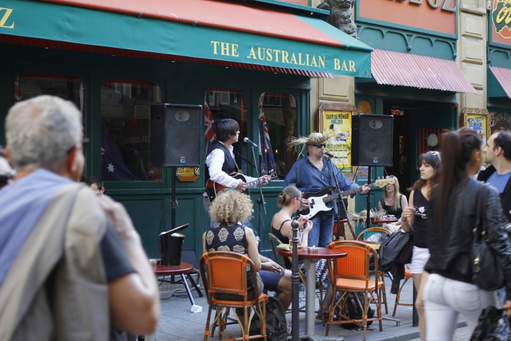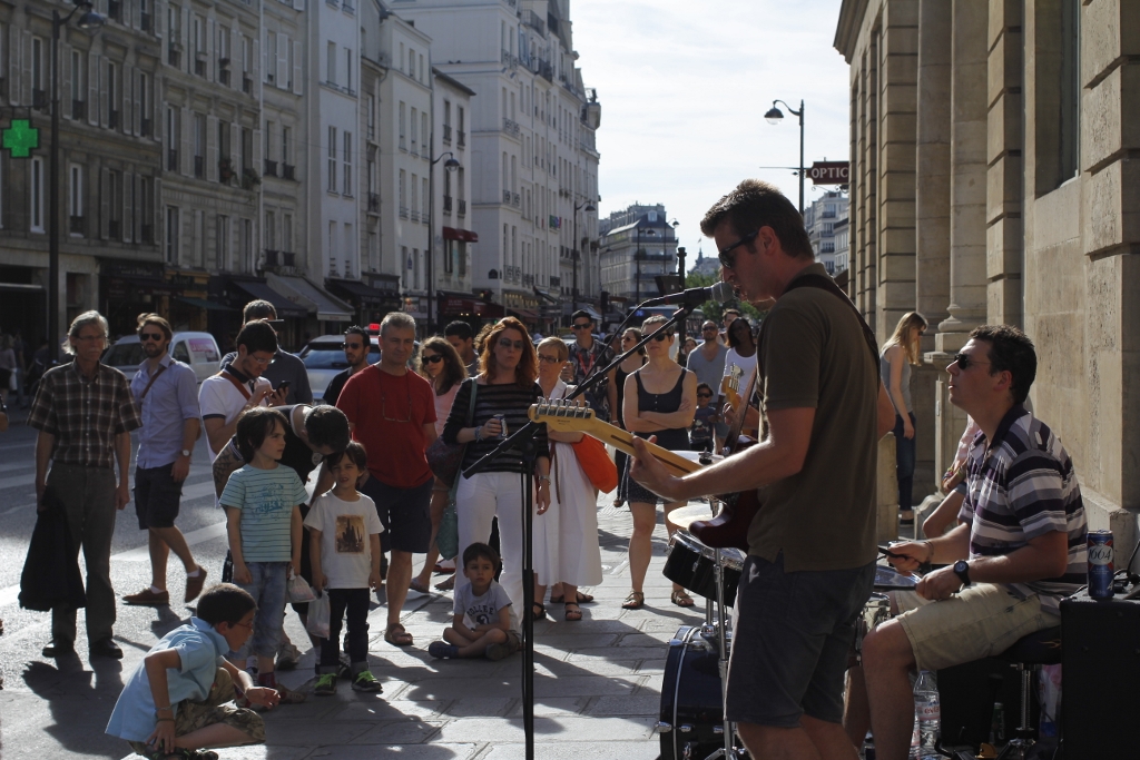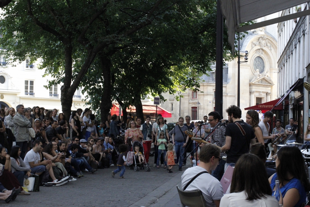 Street performance at the intersection between Rue des Tournelles and Rue Saint-Antoine, with the Temple du Marais in the background.