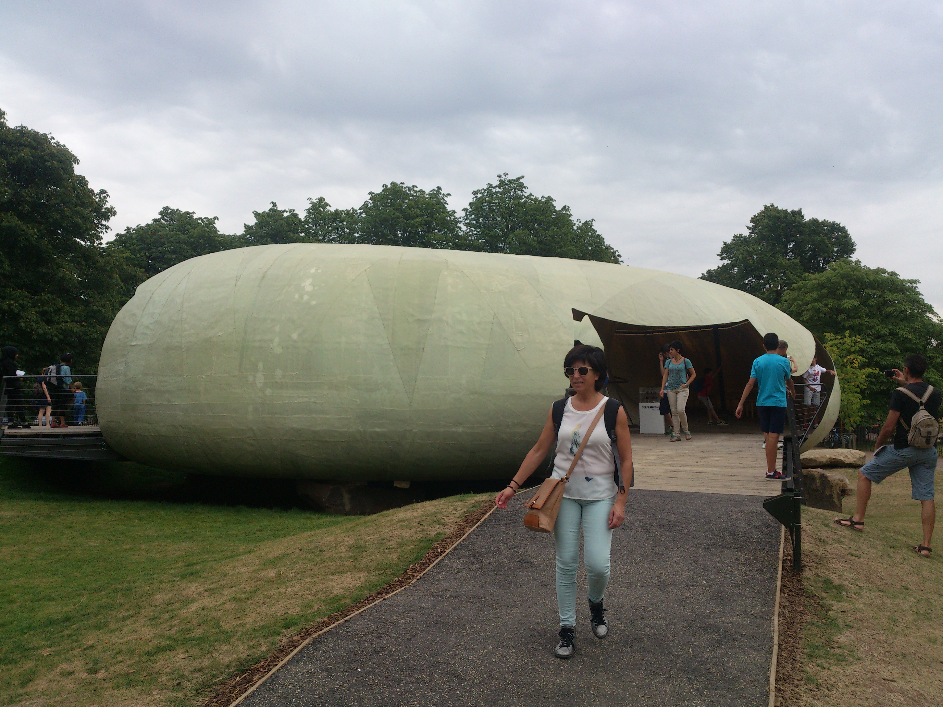 I went with a friend from university, Maria, and we were delighted to find a short queue early in the afternoon. Feeling rather parched we conversed inside the Serpentine Pavilion with a latte and a bottle of water from the café that resides within. The 2014 Serpentine Pavilion was designed by Chilean architect Smiljan Radić and resembles a cocoon-like structure resting on several large pieces of stone. My friend compared it to a doughnut.