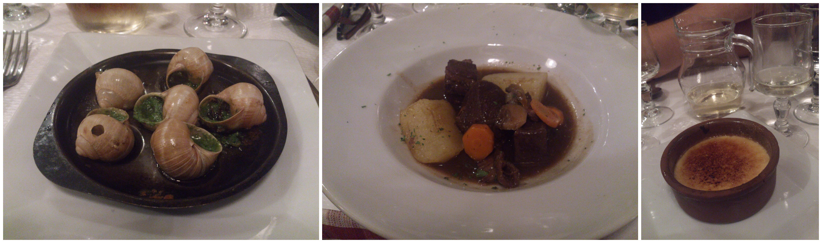 Escargot; boeuf bourguignon; crème brûlée.