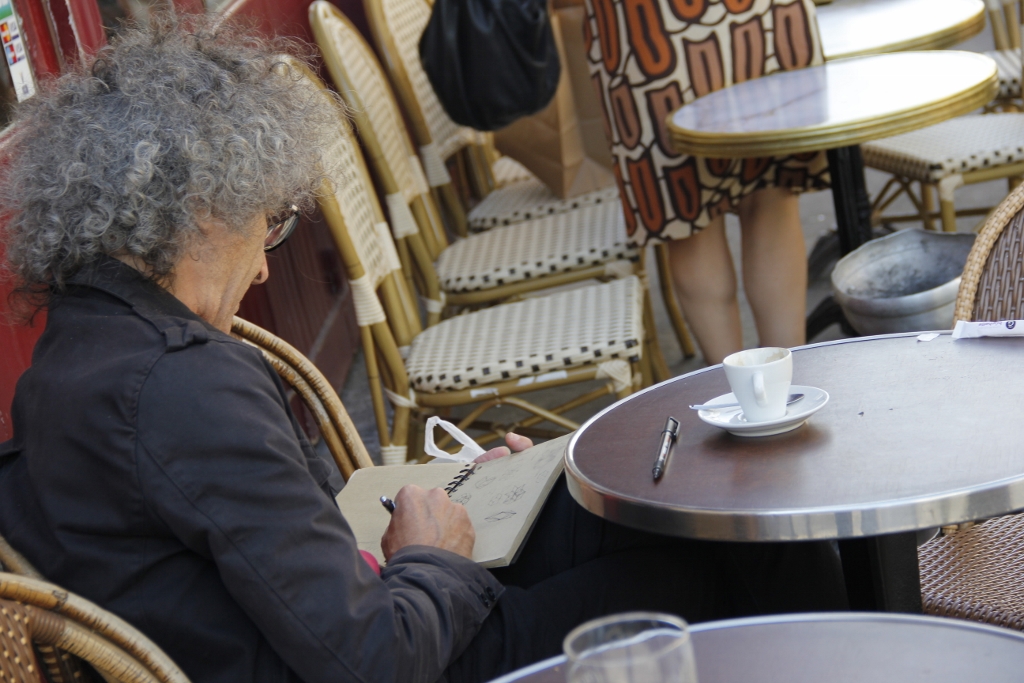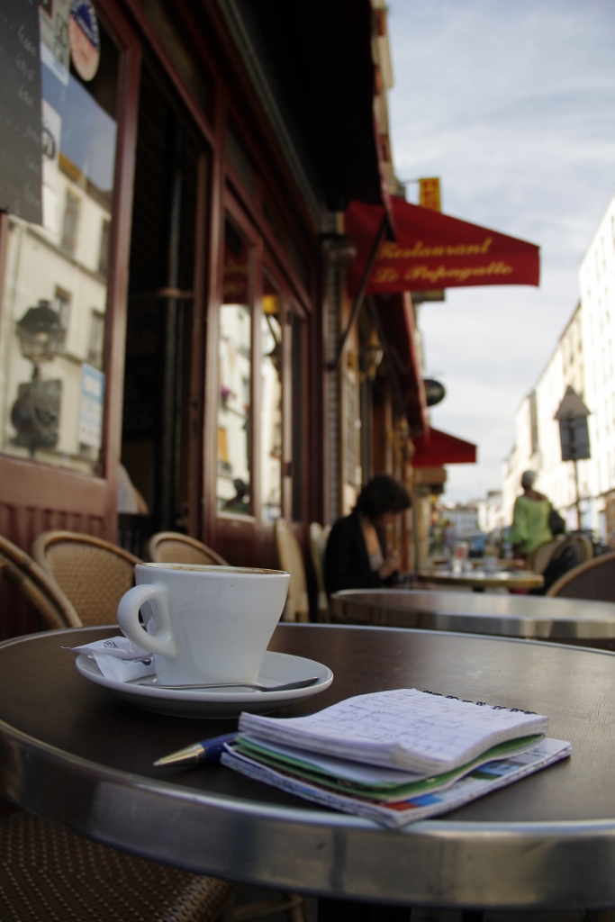 Pen, notebook, and a café crème at Au Passage des Artistes.