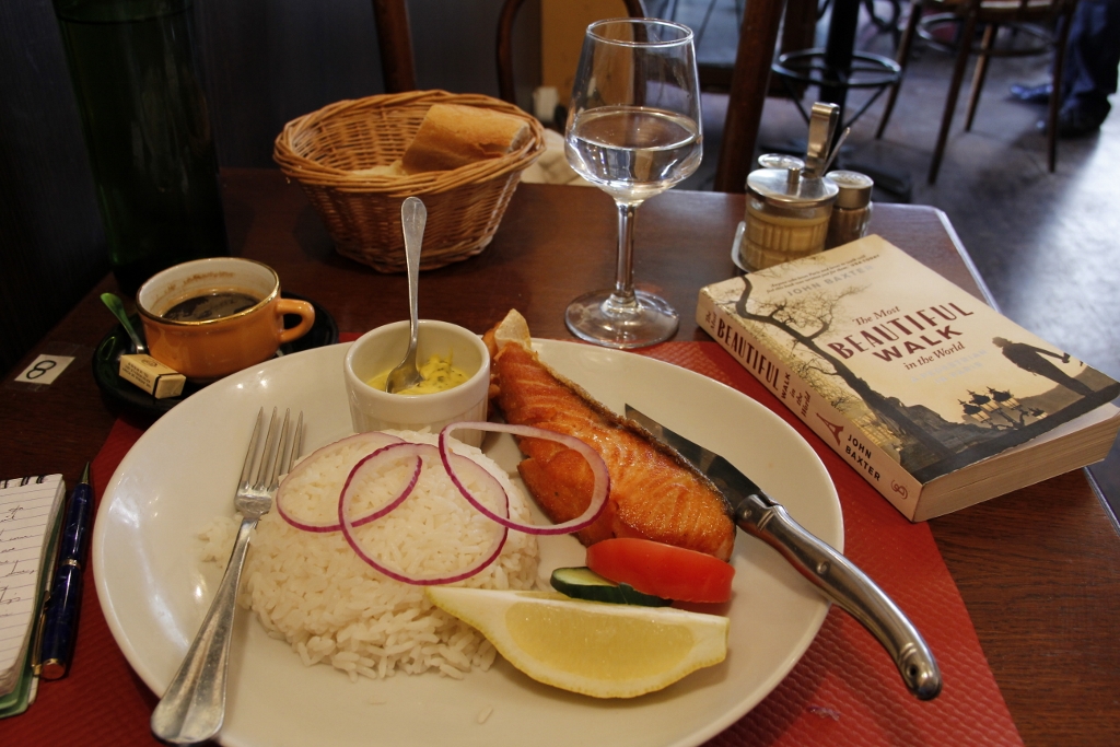 I picked a table in a corner between a wooden screen and a wall with two framed pen drawings – signed “R. Levy” – and a photograph hanging from its surface. The black-and-white photograph was of a singer in mid-performance, accompanied by a female accordionist while a bartender to the left of the image serves wine to standing customers. After observing the menu and having a carafe d’eau brought to me, I indulged in my relaxed environment with a bit of travel reading. Behind me I could hear the sound of French locals dining and conversing and clinking their glasses. Close to the entrance, on the other wall, I could hear two women talking in English with glasses of rosé – they might have been mother and daughter.