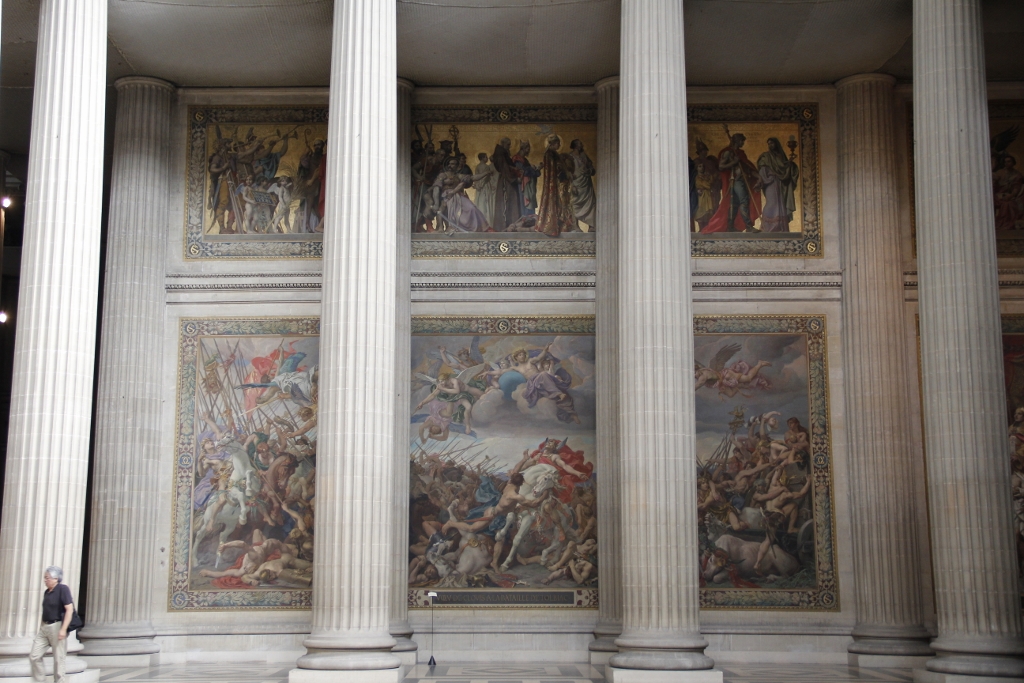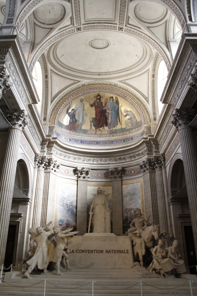 At the base of the pillars below the dome was a group of four sculptures commemorating events such as the French Revolution and the Bourbon Restoration. Corinthian columns emphasise the Greek-cross outline of the interior, and where the high altar should have been was François-Léon Sicard’s sculpture The National Convention (1921-24), depicting Marianne – the national emblem of the French Republic – surrounded by parliamentary members and soldiers from the second year of the First French Republic. On the wall behind this was a battle scene, and directly above was a fresco reminiscent of Byzantine art.