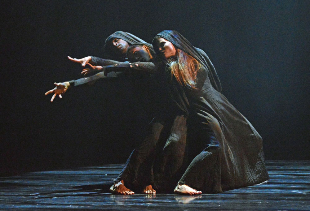Before the interval, a performance of Miguel Altunaga’s Dark Eye brought us to a different set of myths, those of the Fates. Almost exclusively fixed at the number three, these incarnations of destiny have taken on many names throughout human history: the Moirai in Greek mythology, the Parcae in Roman mythology, the Norns in Germanic paganism, and most famously the Three Witches in William Shakespeare’s Macbeth. Altunaga’s piece presents them as the archetypal creatures we have been accustomed to: sinister, delusional, uncanny, crooked, and certainly not of this world. The choreography is ritualistic and dramatic, yet dissonant at times, backed by a tribal-sounding arrangement of a viola, cello and percussion. There are moments of solo intervention but their roles as a coordinated unit in the lives of mortals quickly suppresses their individuality.