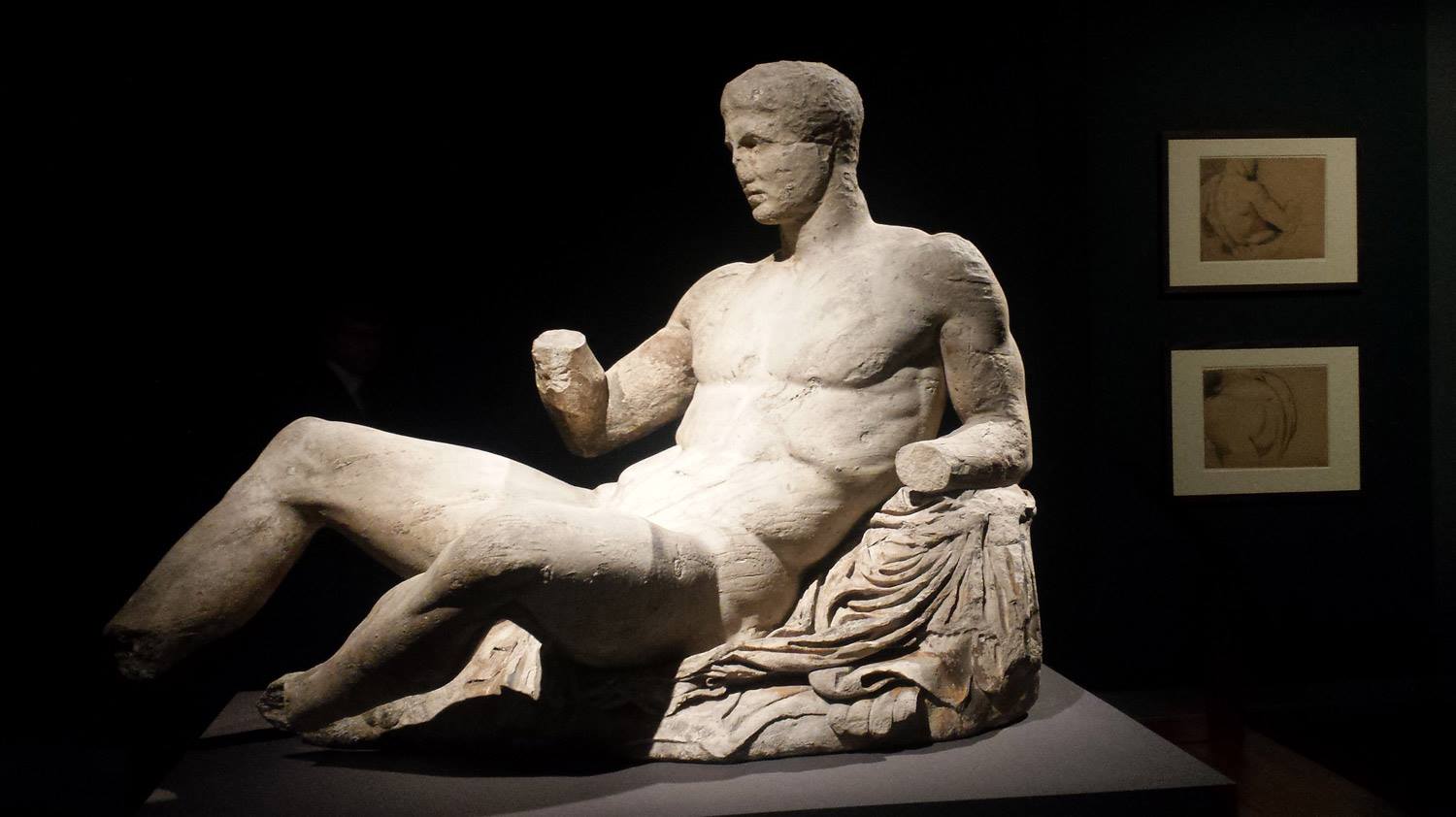 On the other side of the room, the figure of Dionysos once belonged on the east pediment of the Parthenon in Athens. The group was largely made by Pheidias and his assistants who was also the sculptor for the lost colossal chryselephantine (gold and ivory) statue of Athena Parthenos which stood inside the temple. The Elgin Marbles were removed from the Parthenon by Thomas Bruce, 7th Earl of Elgin, commonly known as Lord Elgin, between 1801 and 1812. They were transported into Britain by sea. This was part of his aim to preserve for posterity those works that survived after the various sieges to the Acropolis in the centuries previous. The acquisition was likened to vandalism and looting, and it was viewed with much negativity from the British Government at the time. The legalities surrounding the debate between Great Britain and Greece are still ongoing. In 1816, the government purchased the collection of sculptures from Lord Elgin due to his severe financial problems upon his return. The group was purchased for £35,000, considerably less than the estimated £75,000 paid by Elgin. They have remained with the British Museum ever since, first in the Elgin Gallery, before being moved into the purpose-built Duveen Gallery where they are now displayed in their entirety. Two drawings of the Dionysos statue by the English painter Benjamin Robert Haydon show his interest in the defined musculature of the figure’s back.