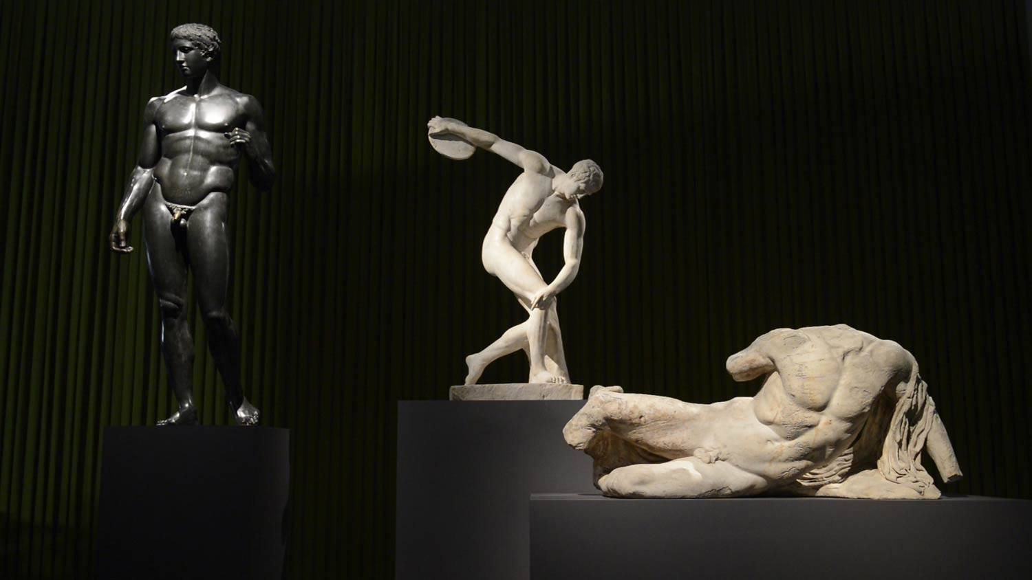Finally, at the back of the room lies Polykleitos’ Doryphoros, Myron’s Diskobolos, and the river-god Illissos from the west pediment of the Parthenon in Athens, after an original design by Pheidias. These three represent the three students of the celebrated sculptor Ageladas, who later became some of the greatest masters of Ancient Greek art. All three had varying approaches to their practice, and each aimed to demonstrate the idea that the male body in sculpture could be both beautiful and intellectual.