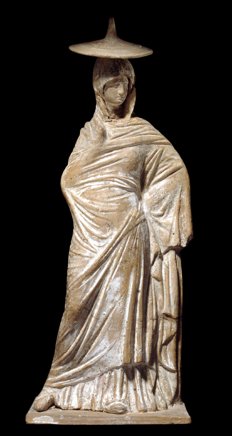 Terracotta figure of a woman. Image via www.britishmuseum.org.