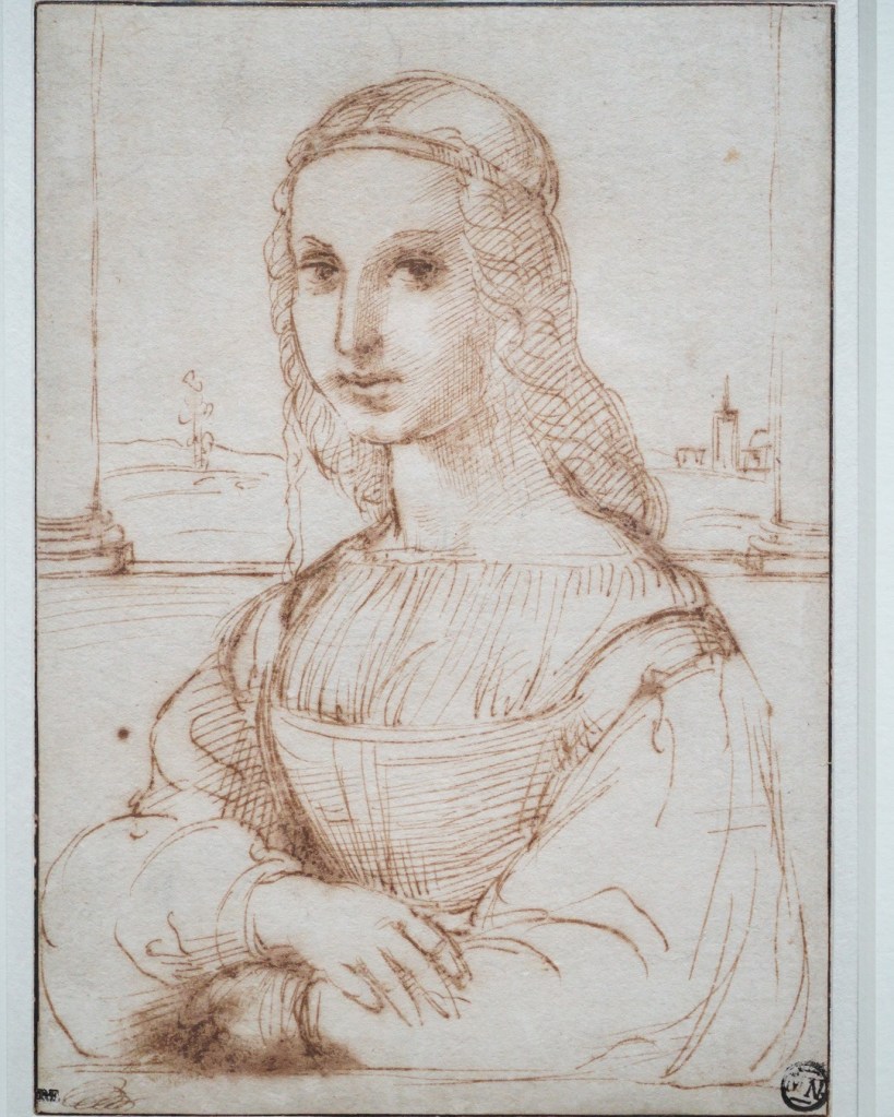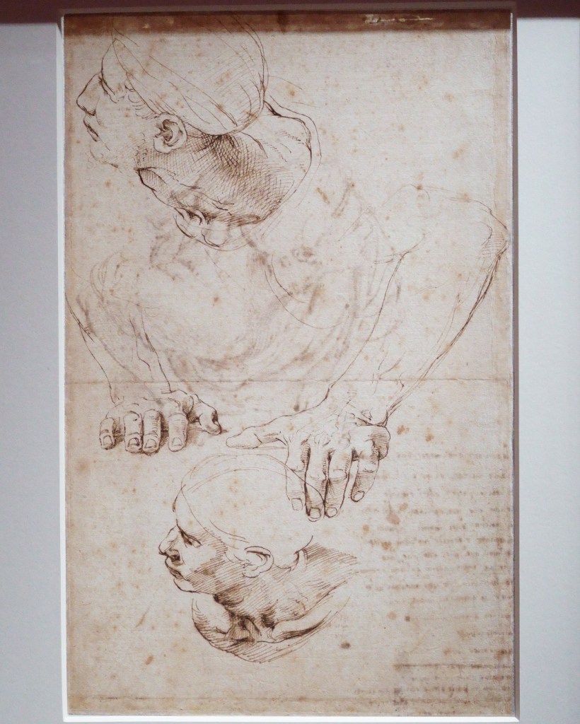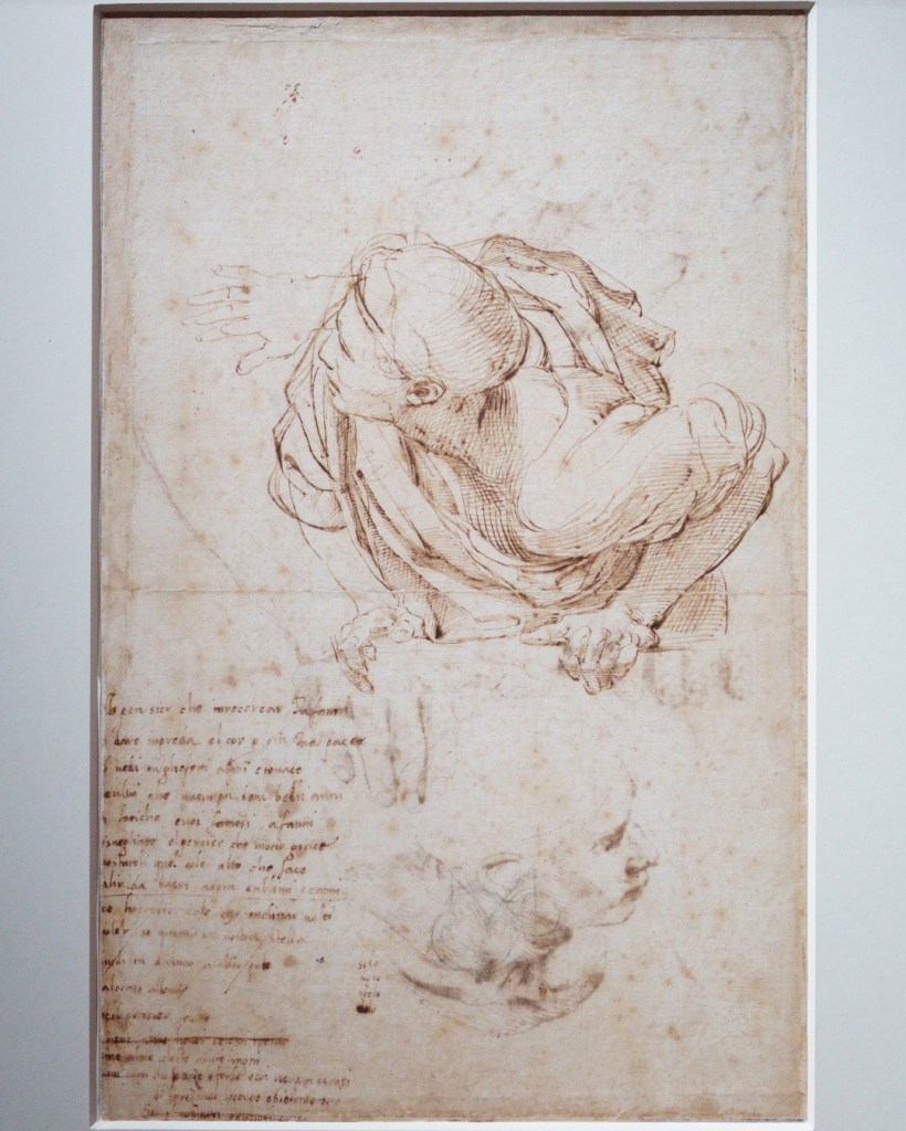 In addition to loans coming from the usual major Raphael collections, there are also outstanding drawings from the lesser known holdings of the Nationalmuseum Stockholm, the Musée Fabre in Montpellier, and even the Royal Institute of British Architects (RIBA). These include a drawing for an Annunciation, studies for a leaning figure in the Disputa, and a profile drawing of the entablature of the Pantheon’s interior main columns, respectively.