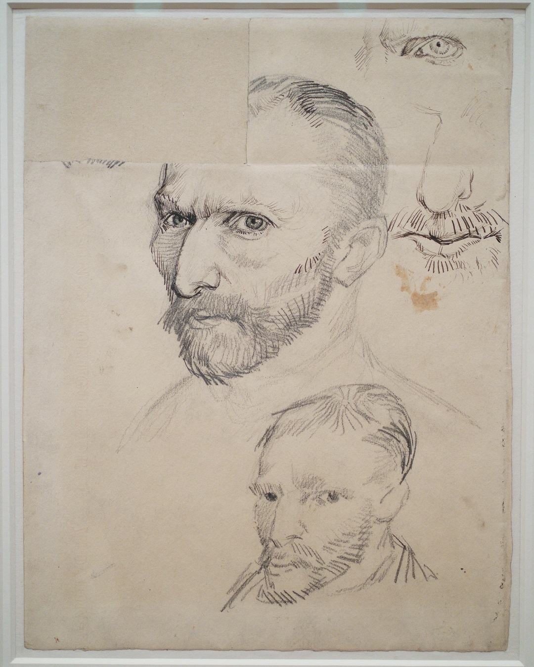 My personal approach is looking at them from below, simulating the effect of raking light. It was fascinating to see the shapes of the stretchers pushing against the canvas, but also some of the diagonal incisions on the surface of Self-Portrait with Grey Felt Hat (Van Gogh Museum), one of his most expressively radiant likenesses, perhaps intended as guidelines for his brushstrokes. His early drawn sheet of self-portraits reveals much about the effect of different types of mark-making for a singular medium.