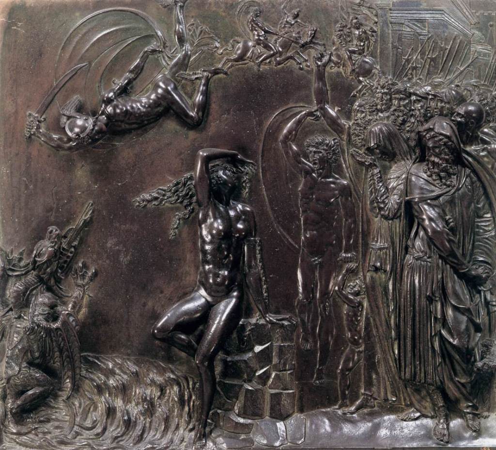 The dramatic elevated pose of Perseus is reminiscent of the figure of Saint Mark in Jacopo Tintoretto’s Miracle of Saint Mark freeing the Slave (1548; Gallerie del Accademia, Venice), executed for the Scuola Grande di San Marco, Venice. Another inspirational source may have been Benvenuto Cellini’s bronze bas-relief of the same subject (Museo Nazionale del Bargello, Florence).