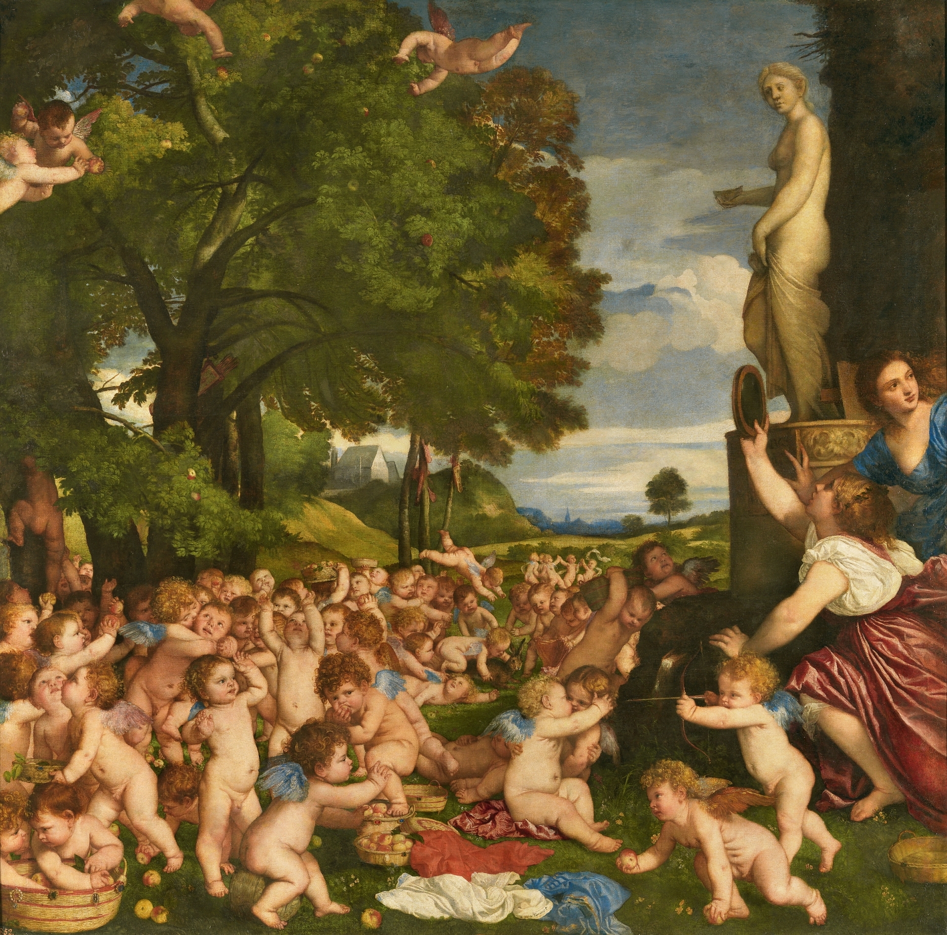 Titian’s first version of this composition was made for Cardinal Alessandro Farnese from 1544 to 1545/46, now in Naples, featuring Cupid instead of the nursemaid. Over the following decades, his workshop made several versions.