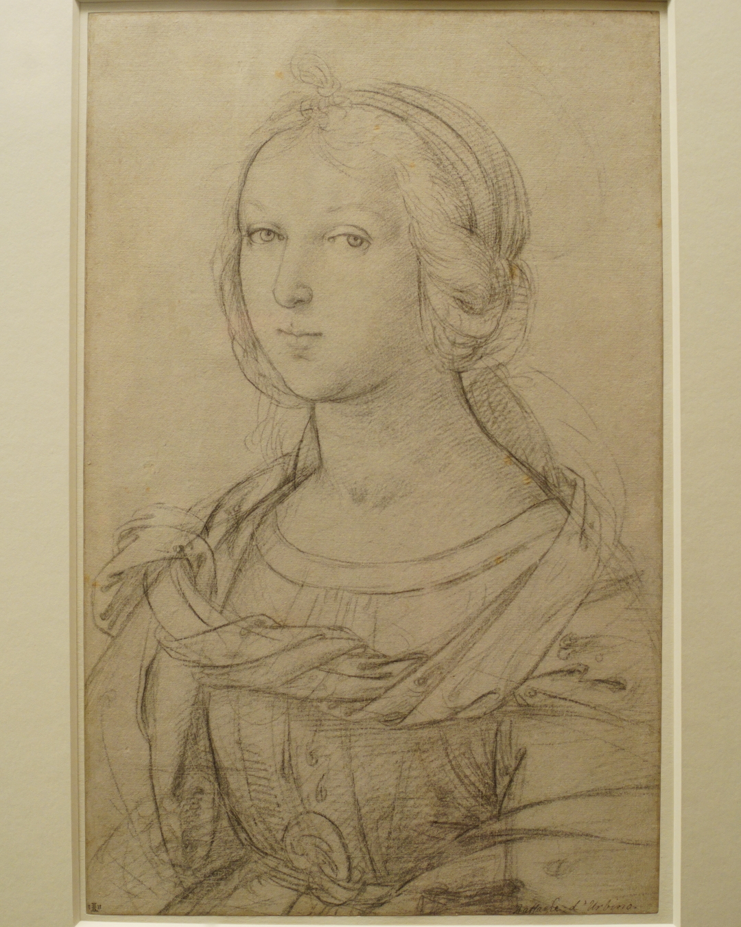 Once thought to be a portrait of Raphael’s sister – impossible; she was born in 1494 – it may have been drawn for a painting of a saint (as indicated by the halo) around 1504. The drawing barely gets exhibited, so I was pleased to see her recent appearance in the Albertina’s Raffael exhibition in 2017-18.