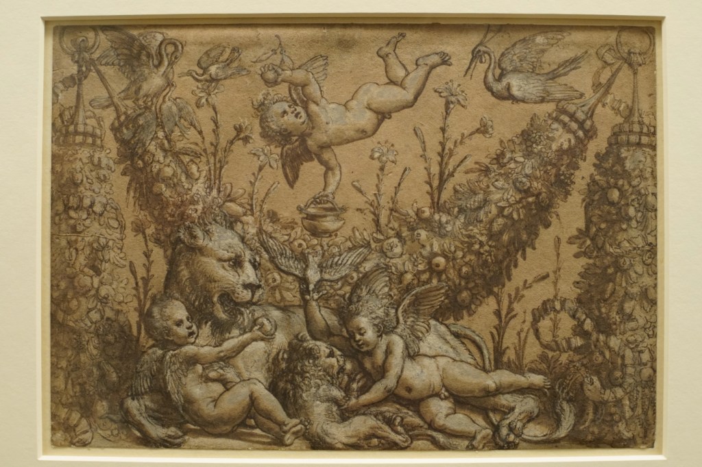 For the ‘lesser’ members of the workshop, the examples exhibited generally showcase their specialisms. Giovanni da Udine was well-known as a painter of still lifes and stucco decoration, so naturally he was also proficient in tapestry design, here represented by a design for the Giuochi di putti tapestries for Pope Leo X.