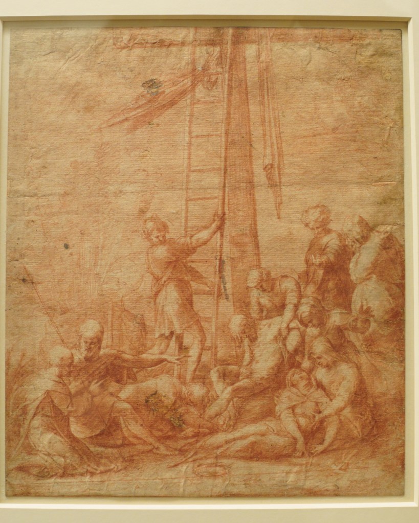 More interesting for me, however, is a gorgeous red-chalk Descent from the Cross. Full of rich, velvety goodness, the composition is a pleasing assemblage of various figure groups and expressions.
