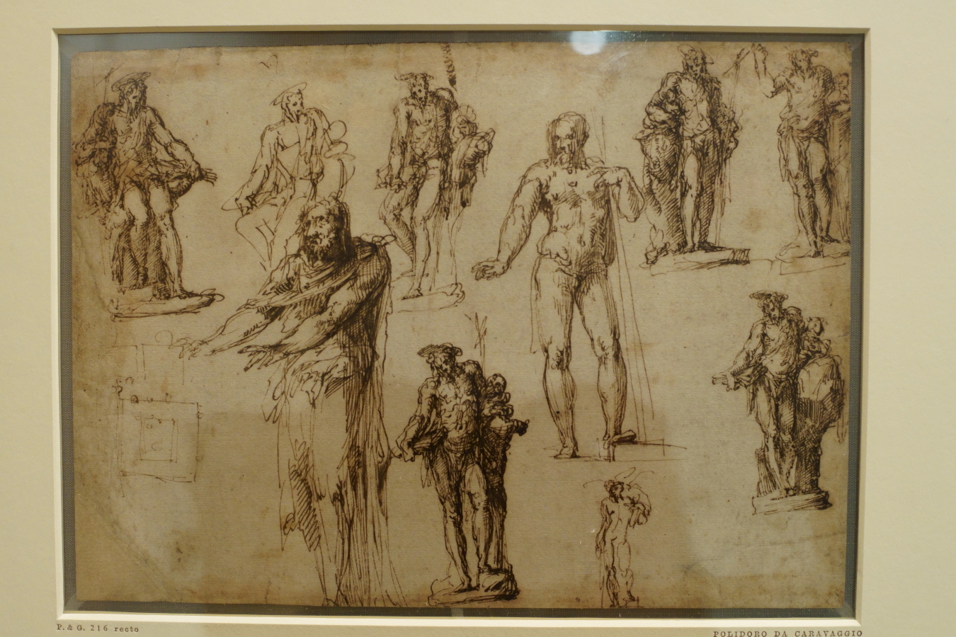 In addition to Polidoro da Caravaggio’s drawings for friezes, there are several drawings showing a more uncharacteristic side of his art: a schoolmistress with her pupils, a Madonna and Child, and a sheet of studies for the figure of a Baptist, perhaps for a free-standing statue.