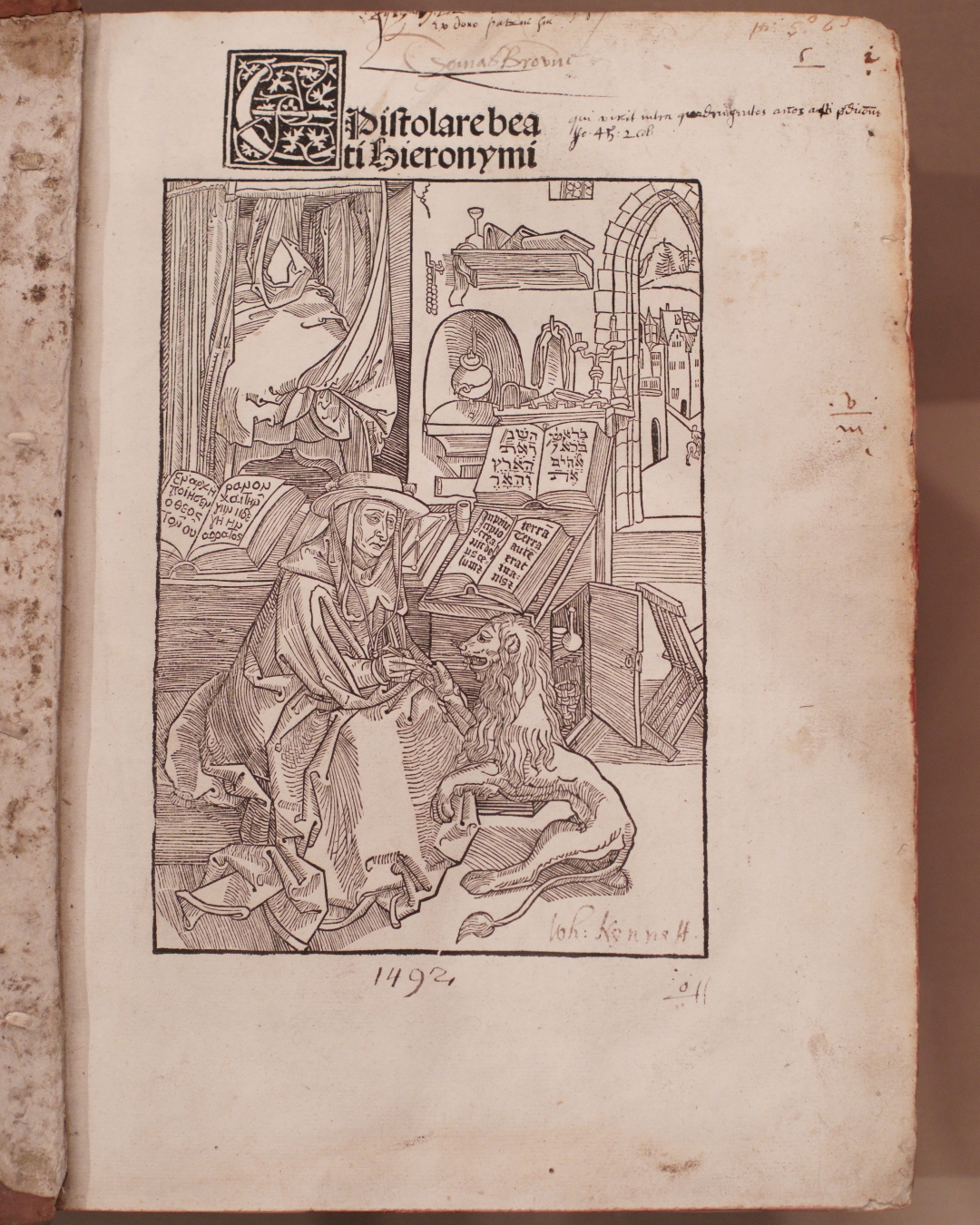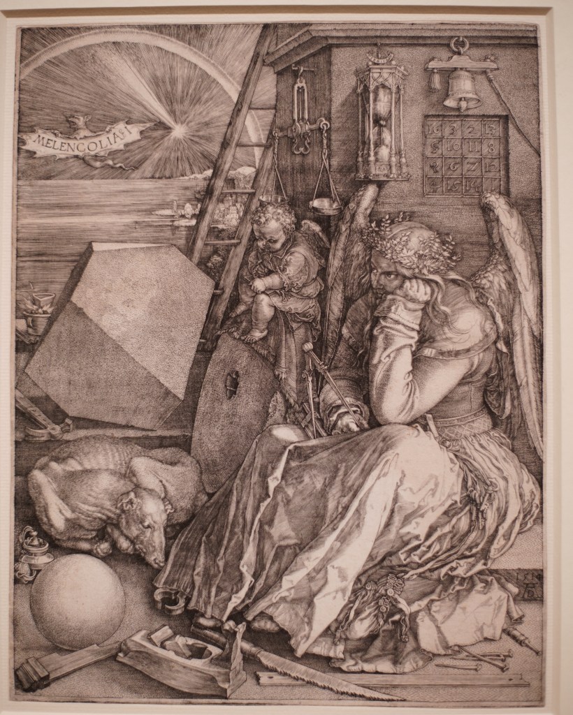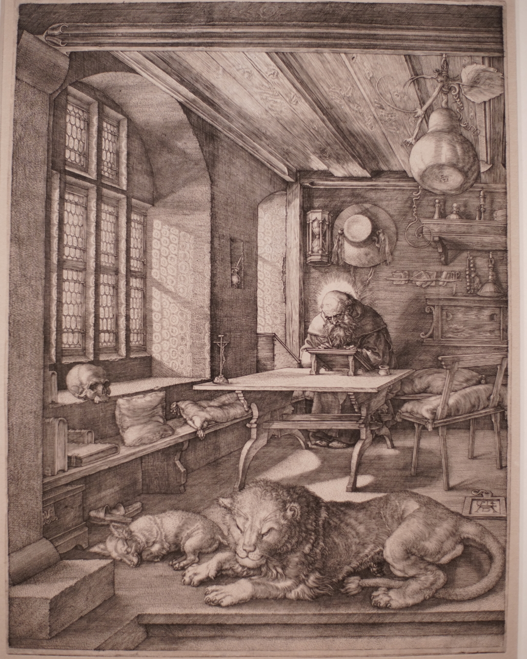 The same room also shows Jerome in his study in one of Dürer’s earliest woodcuts from 1492, made to illustrate an edition of the saint’s letters published in Basel. Fast forward to 1514 and he makes that beautiful engraving with the saint in a brightly lit interior with excellent perspective.