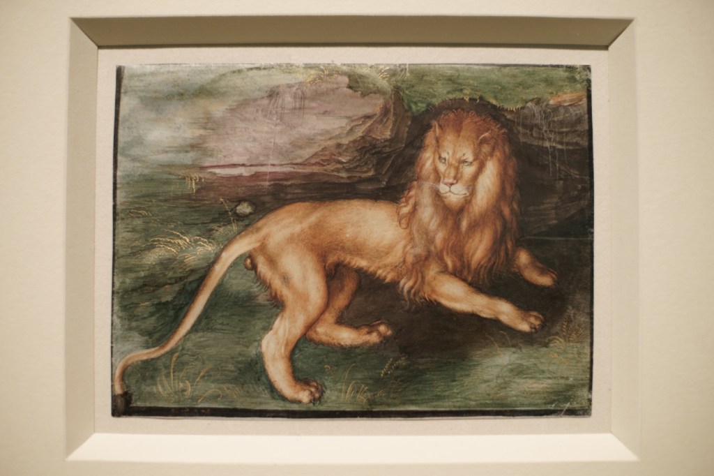 Two years earlier, Dürer drew a similar-looking lion in gouache (Hamburger Kunsthalle, Hamburg), probably adapted from heraldic imagery or sculpture; he probably didn’t see a real one until 1520-21 in the Netherlands.