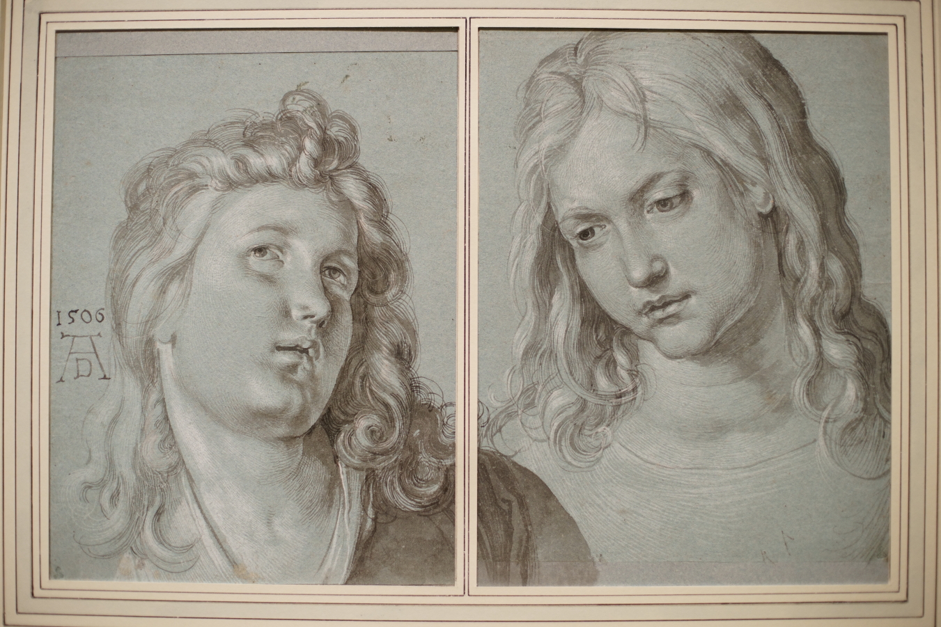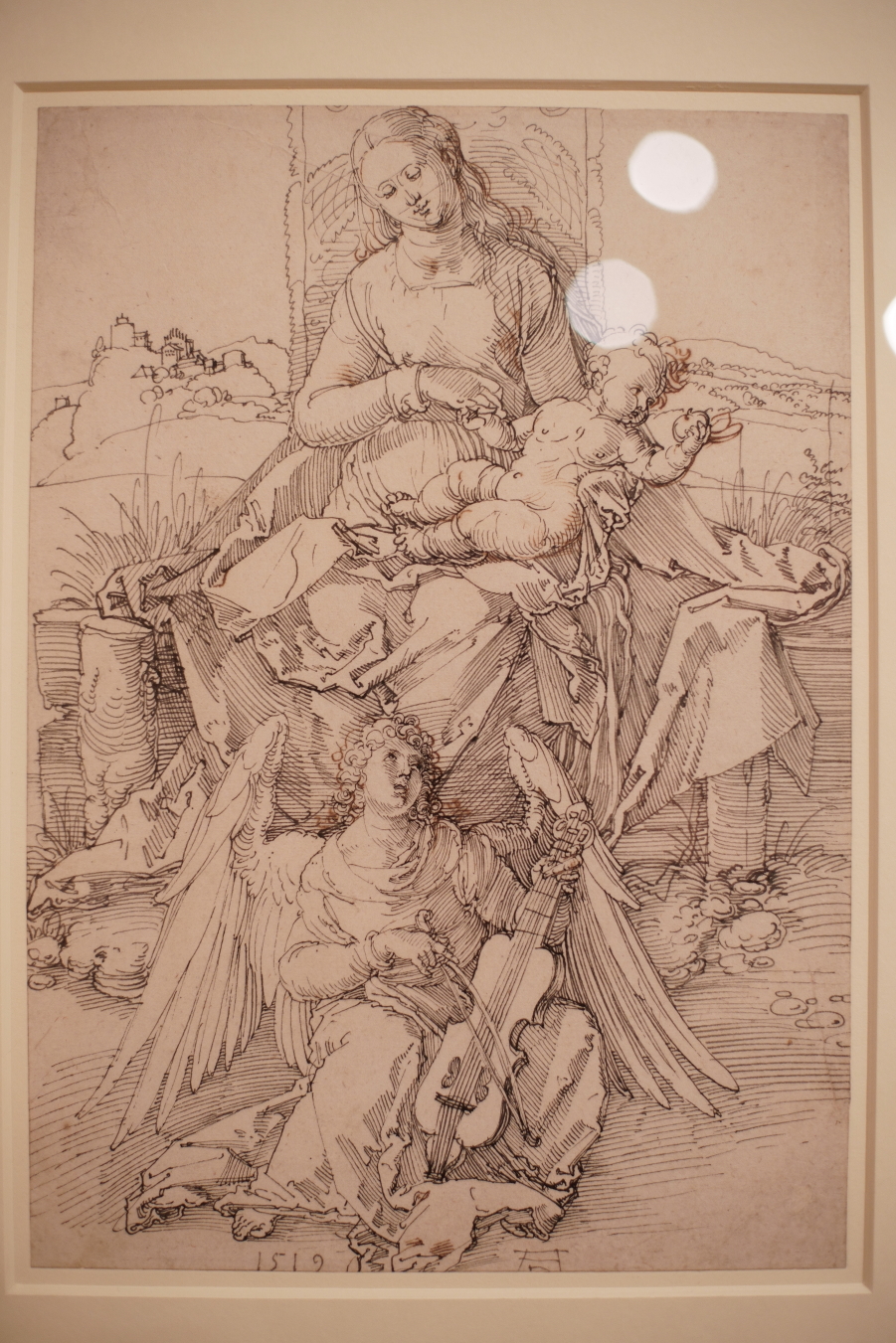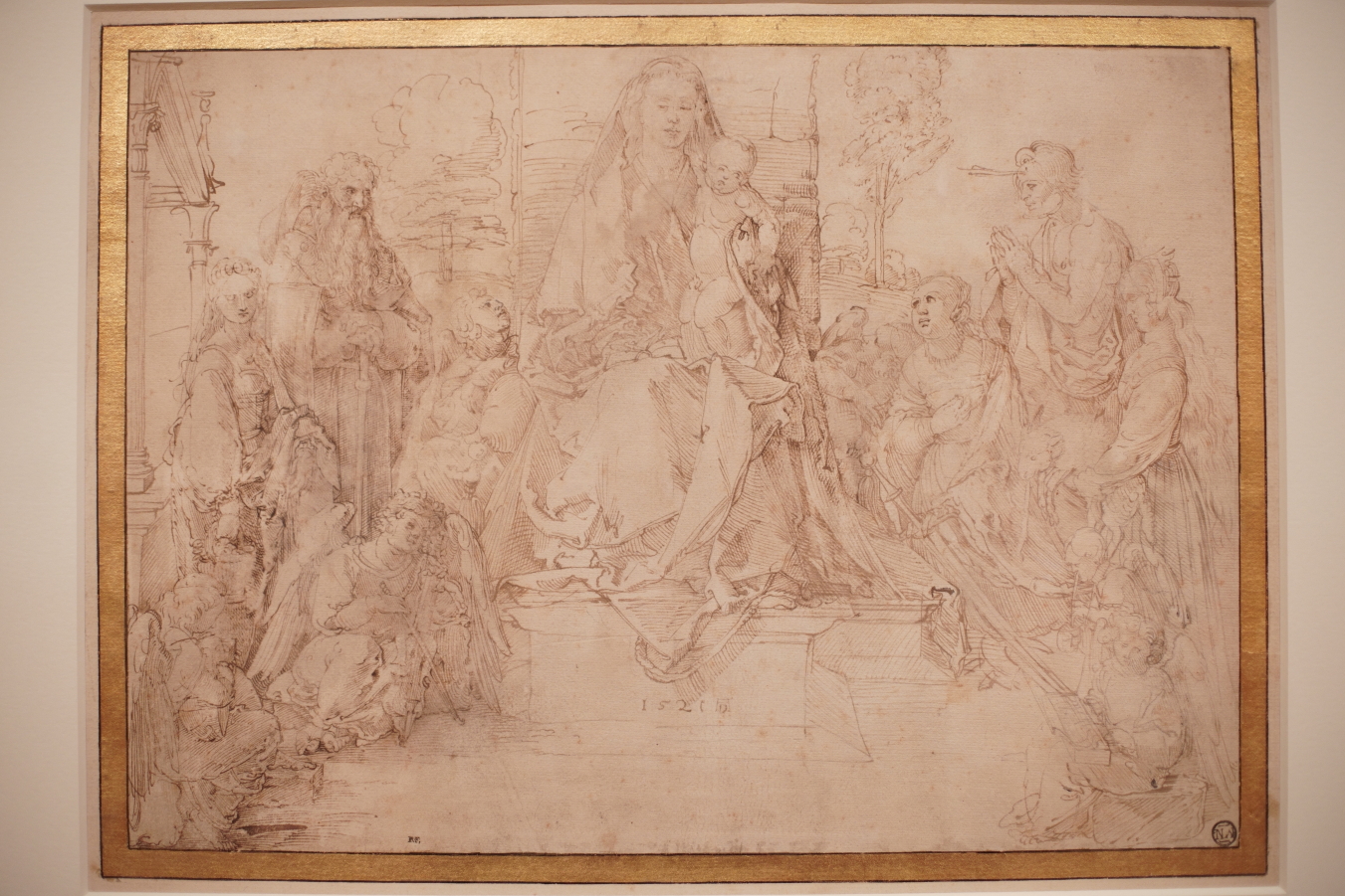 This trope heavily influenced Albrecht Dürer’s own Madonna and Child compositions, having also borrowed the idea of an enthroned Madonna backed by a canopy. He used it several times throughout his career, from the Rosenkranz Madonna (1506) to a much-planned but unexecuted, ambitious Virgin and Child with Saints in 1521-22, dubbed by one scholar as ‘perhaps the greatest tragedy of Dürer’s fate as an artist’. The latter is known only from a large group of drawings, of which some from the Louvre are in the Dürer’s Journeys exhibition.