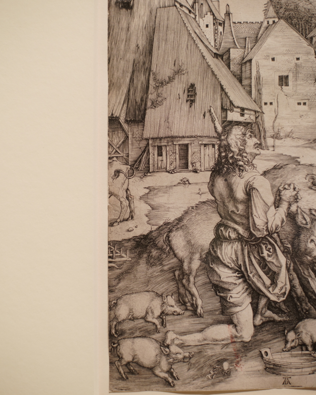 Nearby, this same wilderness scene is reproduced with greater animation and emotional intensity in a large engraving from about 1496-97. Here, the precise burin lines accentuate the jagged cliff edges, Jerome’s musculature, and offers a rich tonal variety across the image.