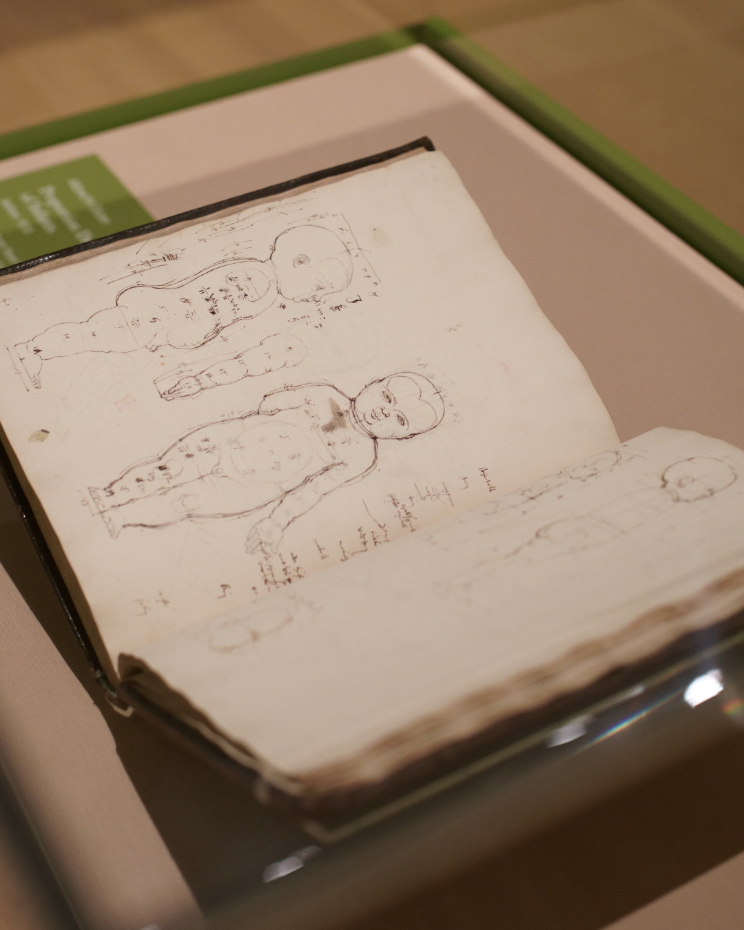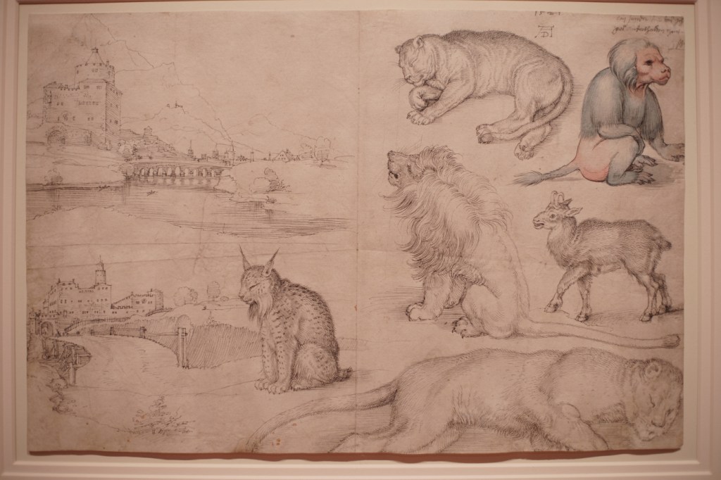 The backbone is Dürer’s sketchbook drawings, which record his encounters with foreign citizens, landscapes, and exotic animals. I appreciated the digital reconstruction of his silverpoint sketchbook; 3 double-sided sheets are shown nearby. It was also humbling to see the only surviving page from Dürer’s original diary of his 1520-21 journey to the Low Countries opposite the only complete copy of said diary.