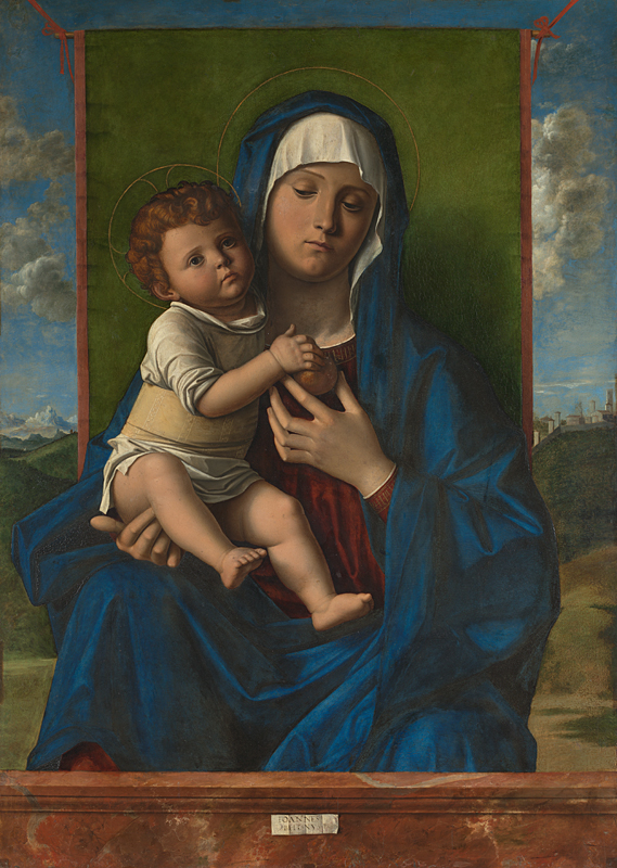 Painted for local clients in Nuremberg, the painting has clear parallels with other Madonna and Child images produced by the Bellini workshop. The strongest of these is having the Madonna hold the upright Christ child with a curtain behind her in a contrasting colour. This device later emerges as a full canopy in the Rosenkranz Madonna (1506; Národní galerie, Prague), which Bellini also did.