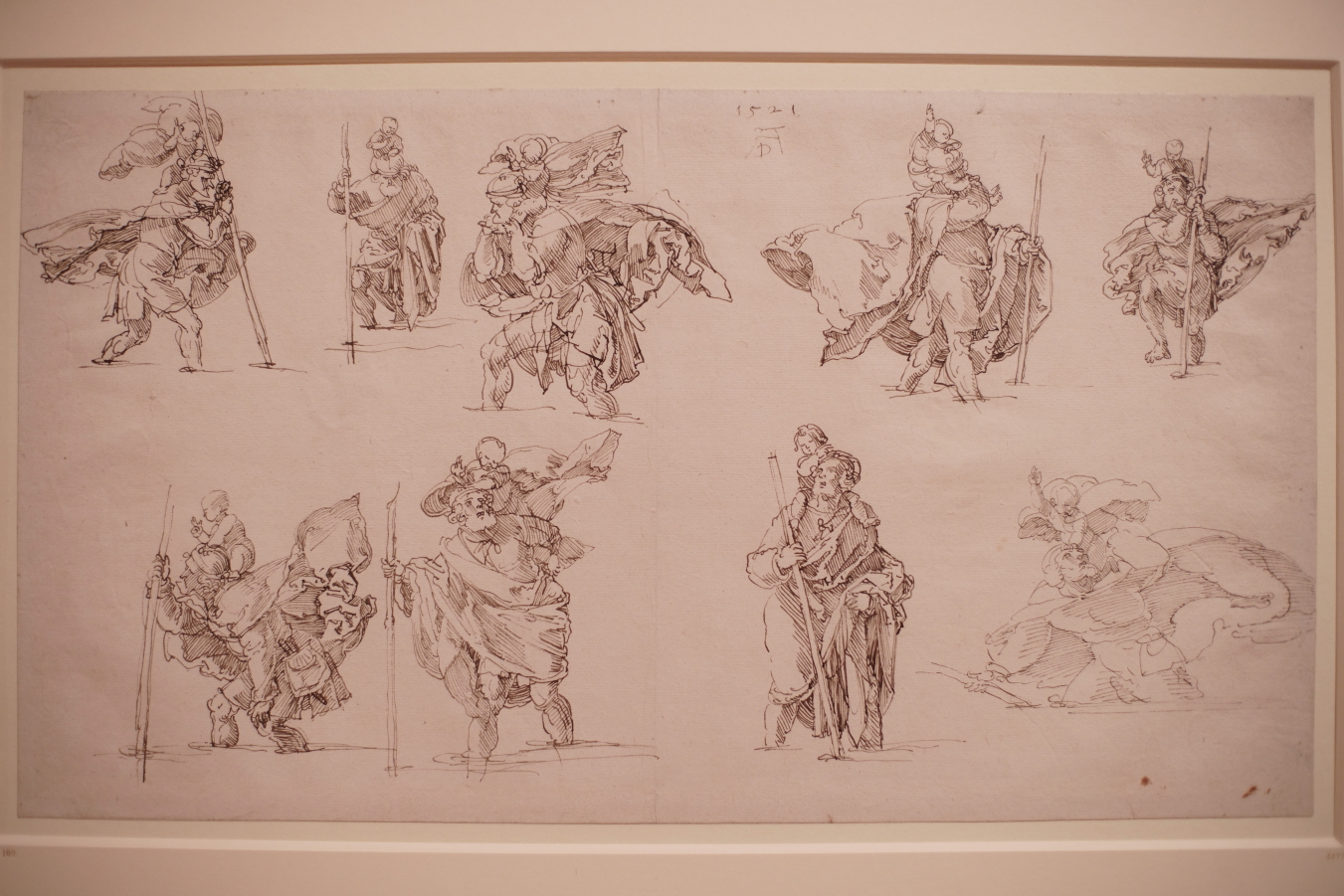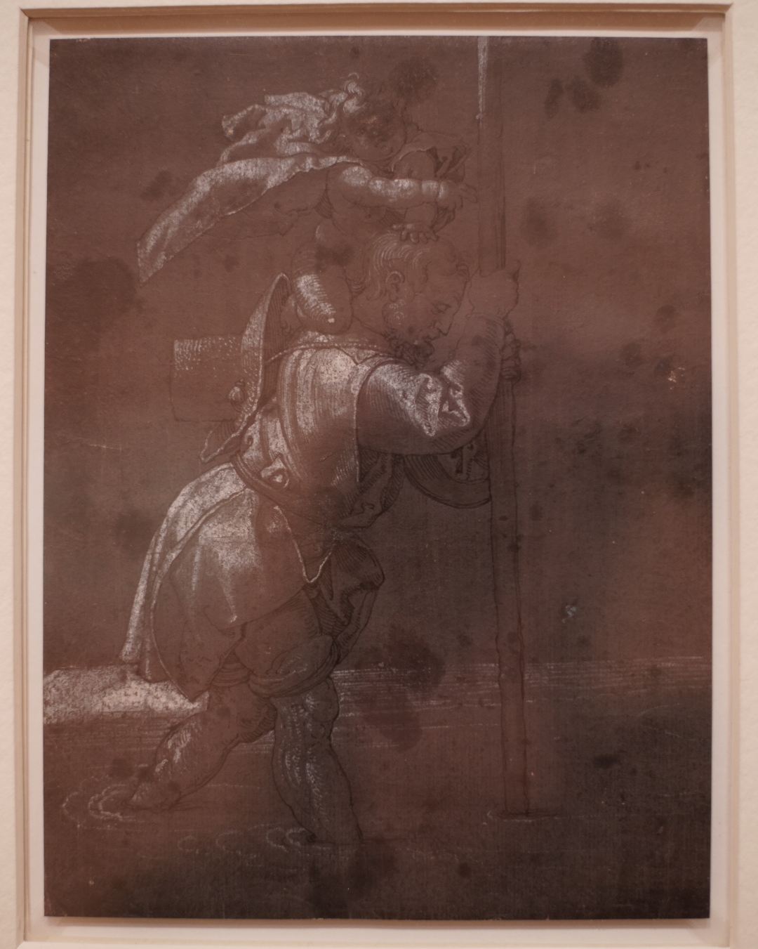 This sheet is a great example of Dürer’s fluid inventiveness and confident draughtsmanship. Each sketch, with barely a correction in sight, considers different ways for the saint to interact with the Christ Child on his back, sometimes with no interaction at all.
