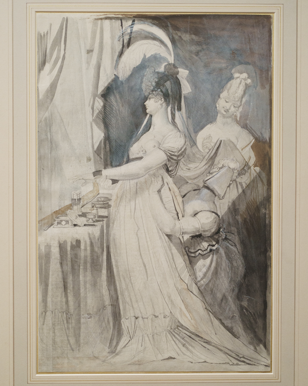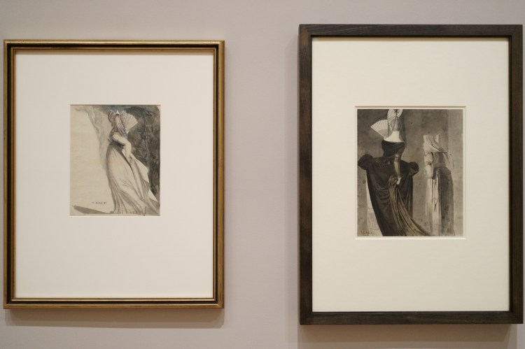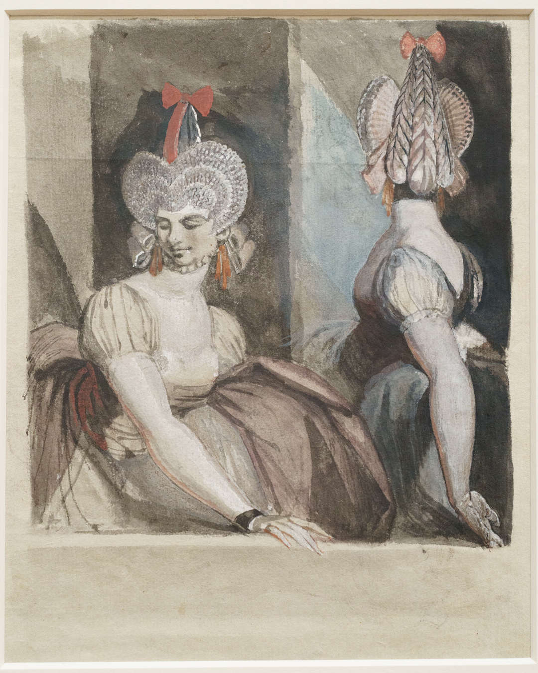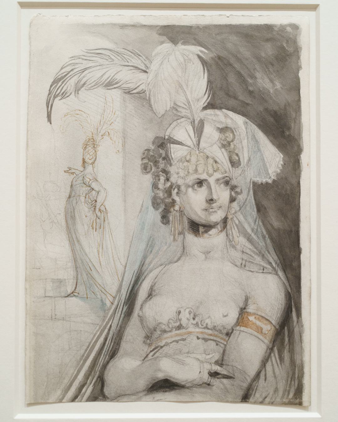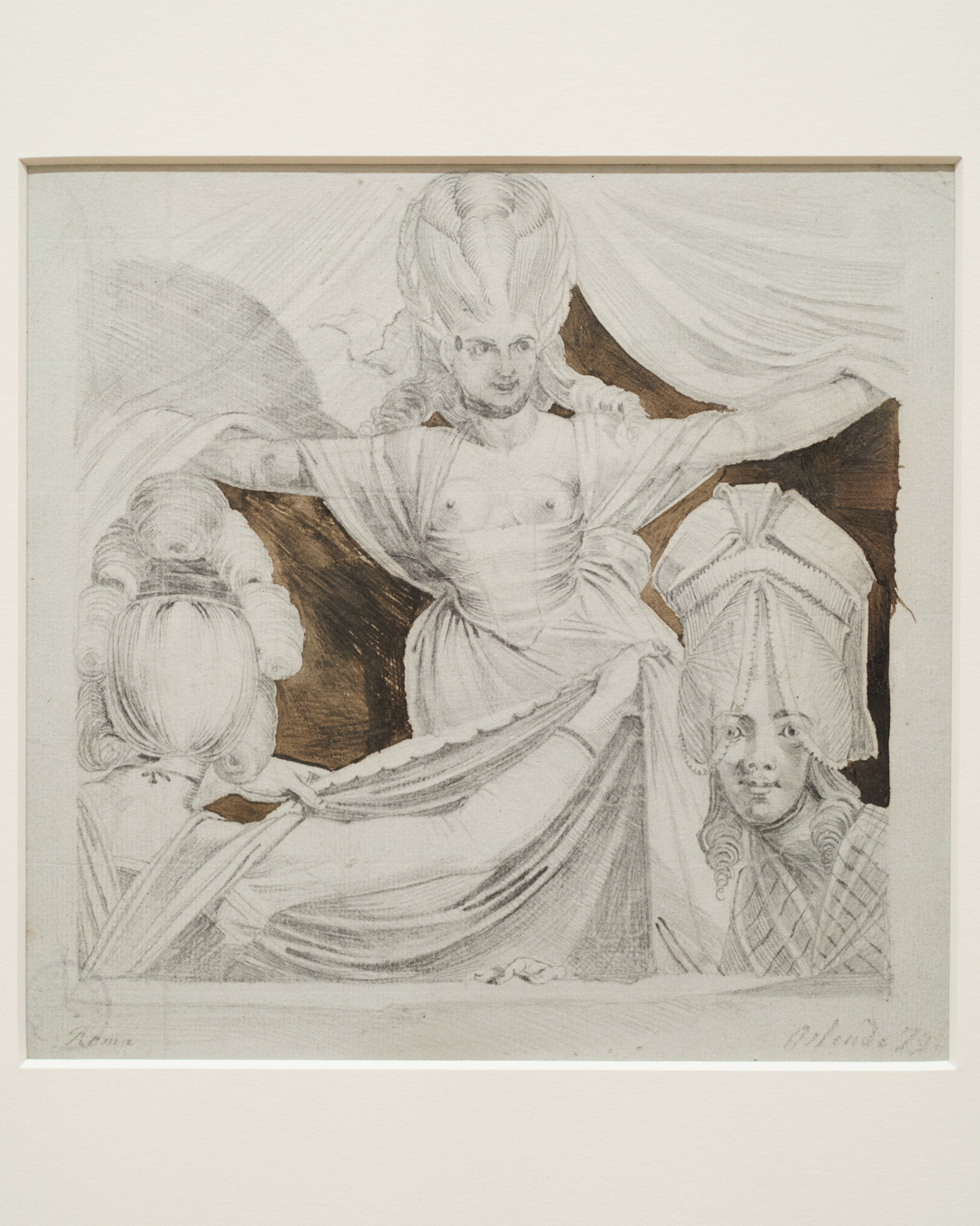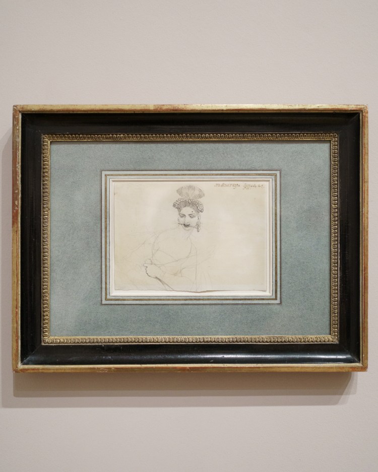 Unwittingly, these drawings also offer a kind of documentation of fashionable clothing in Fuseli’s time. To my untrained eyes, there were a lot of ribbons and bows, massive hats and braided hair, and overall loose dresses secured at the waist for an hourglass figure. A fair bit of freeing the nipple too when it comes to courtesans, but they also get puffy sleeves!