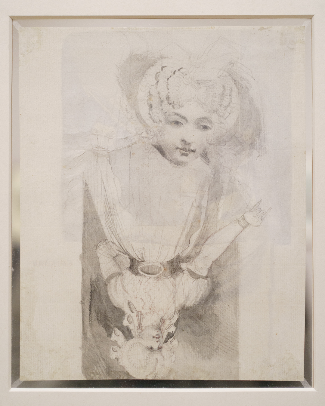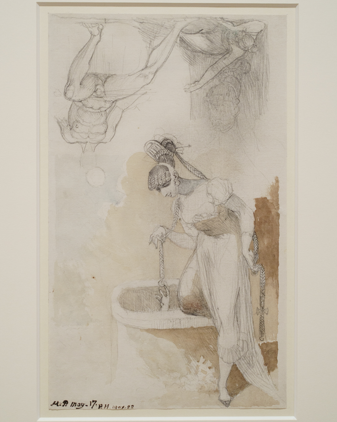 He’s not even hiding it, as seen from the phallic shapes decorating one pen-and-ink drawing of a woman’s bodacious backside, arms outstretched across a dressing-table with phallic supports for legs. She looks practically ready for a spanking (please, God forgive me for writing these words).