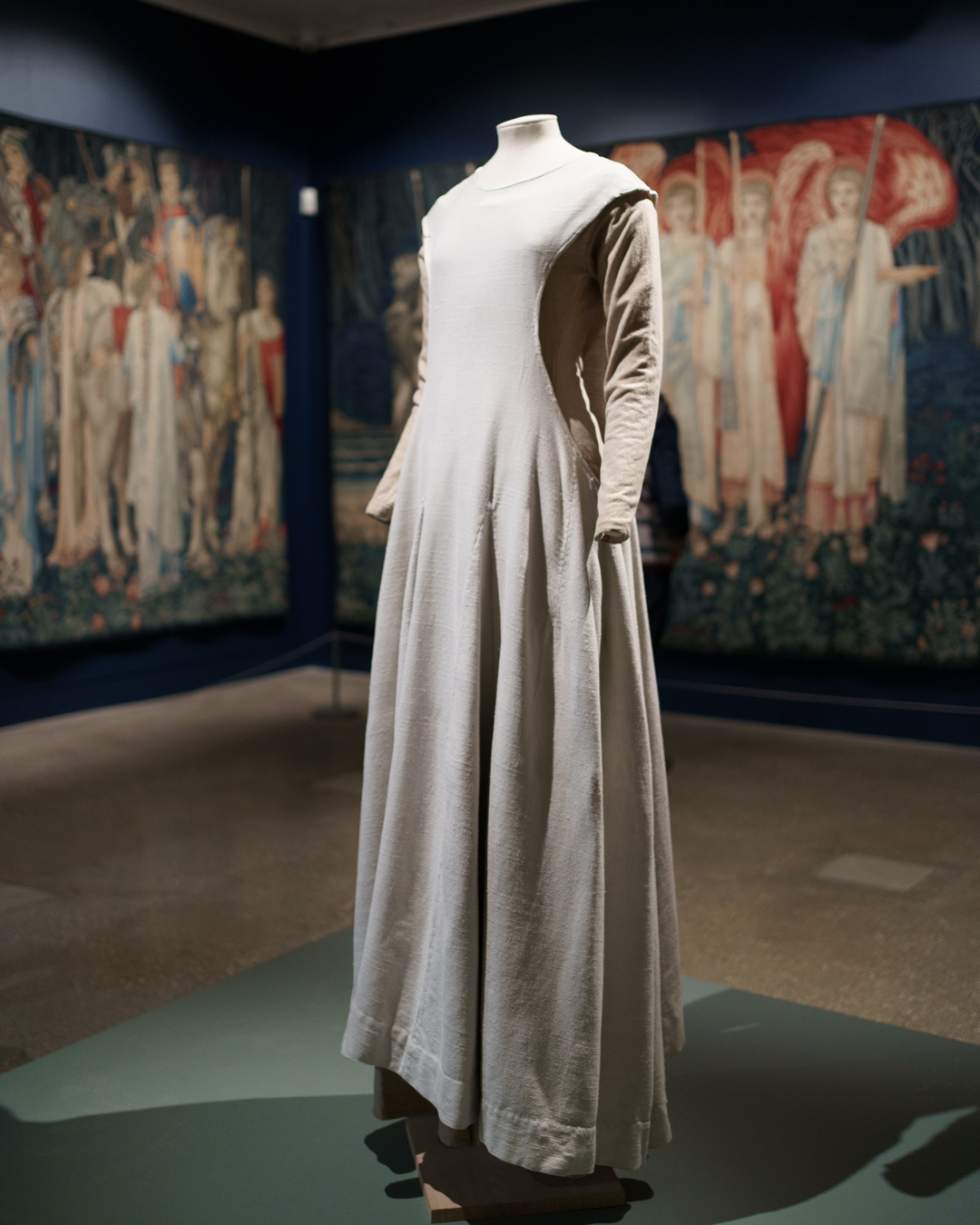 But this exhibition also presents together for the first time William Morris’ only oil painting La Belle Iseult (Tate) with the dress he designed (William Morris Gallery) and had Jane Morris model in for said painting. The only piece missing is the private collection sketch of Jane wearing it, which is helpfully reproduced on the caption.
