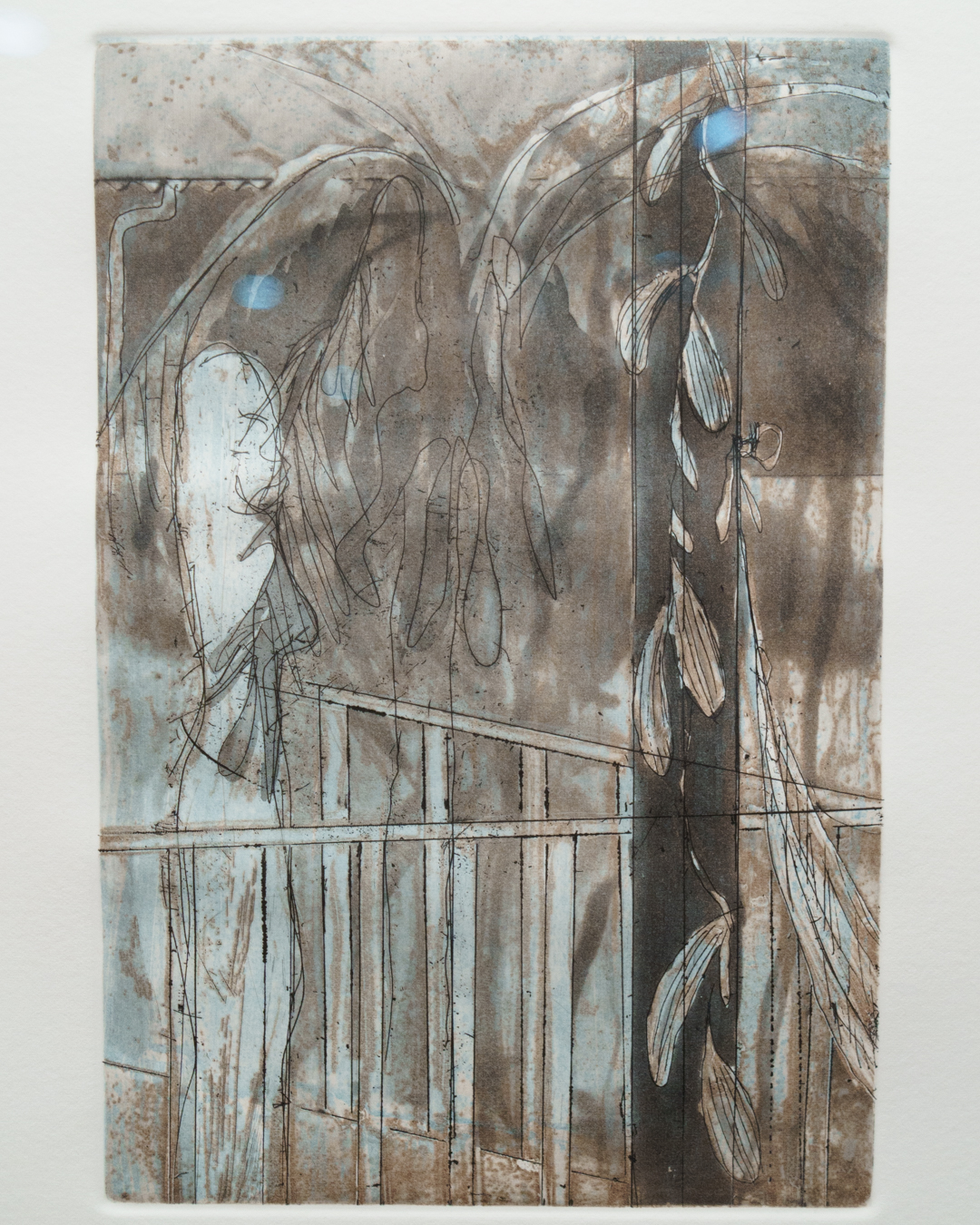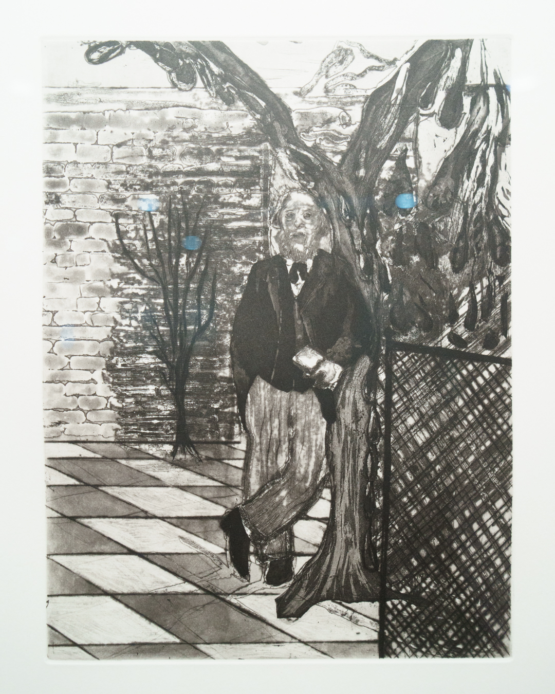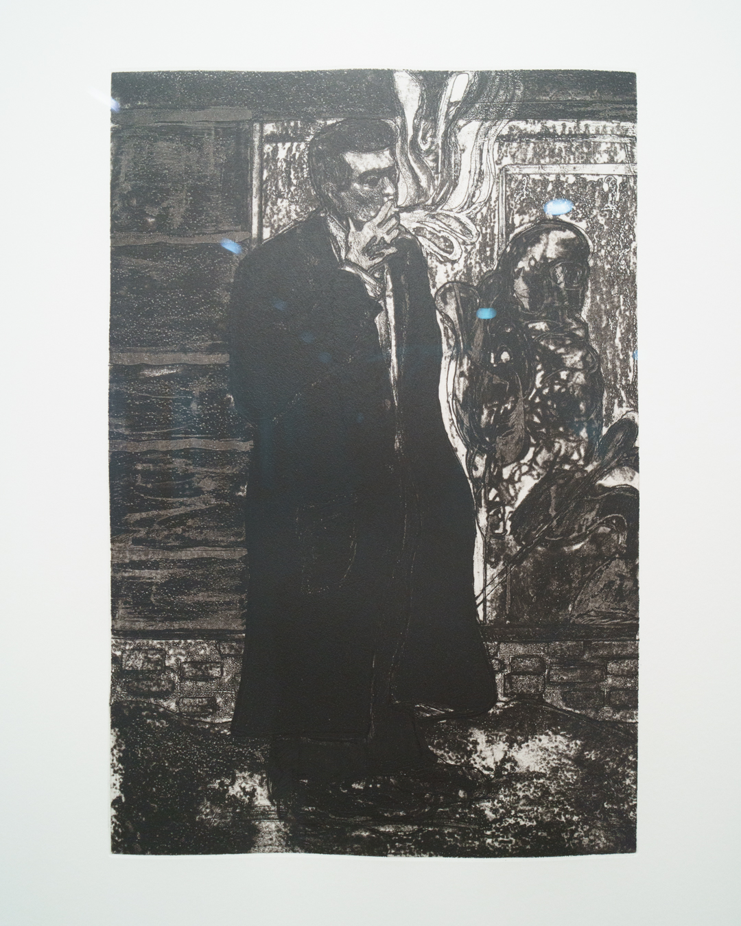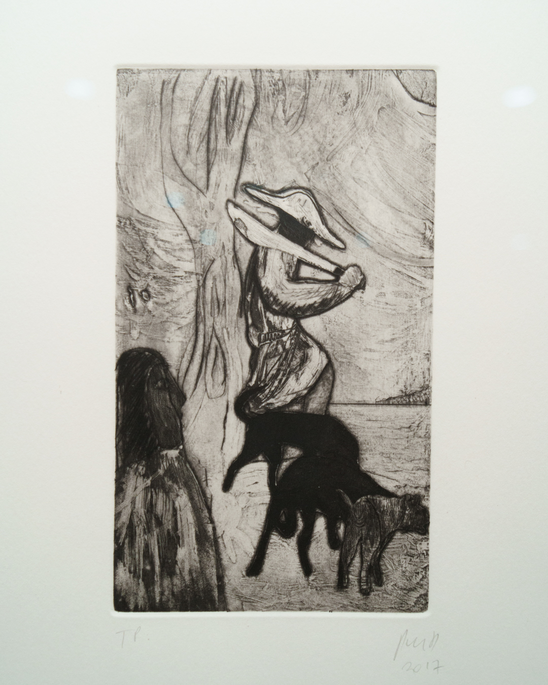 Downstairs, Doig’s etchings inspired by his poet friend Derek Walcott are exhibited for the first time in a free display. They were produced in response to Walcott’s collection of poems Morning, Paramin (2016) that were each inspired by Doig’s paintings. The range of visual effects created by etching with aquatint is impressive; some are perfectly dark without texture, some are closer to watercolours, and the subject matter is incredibly diverse. These come across as very experimental works across multiple dimensions.