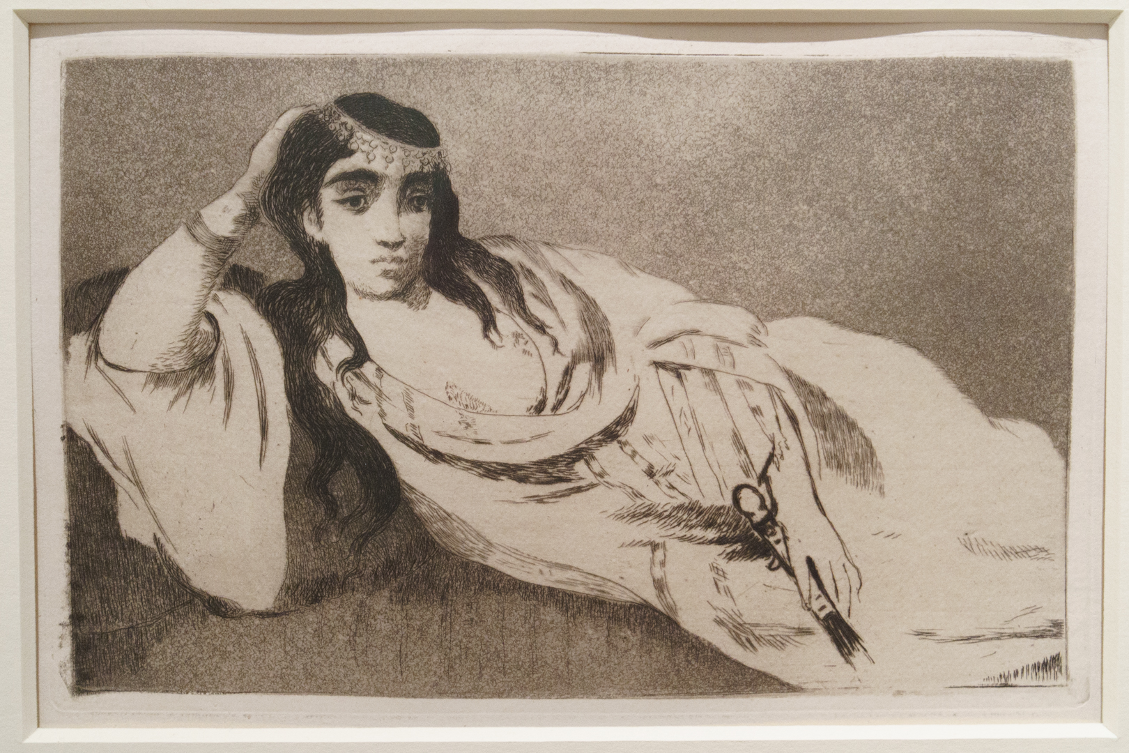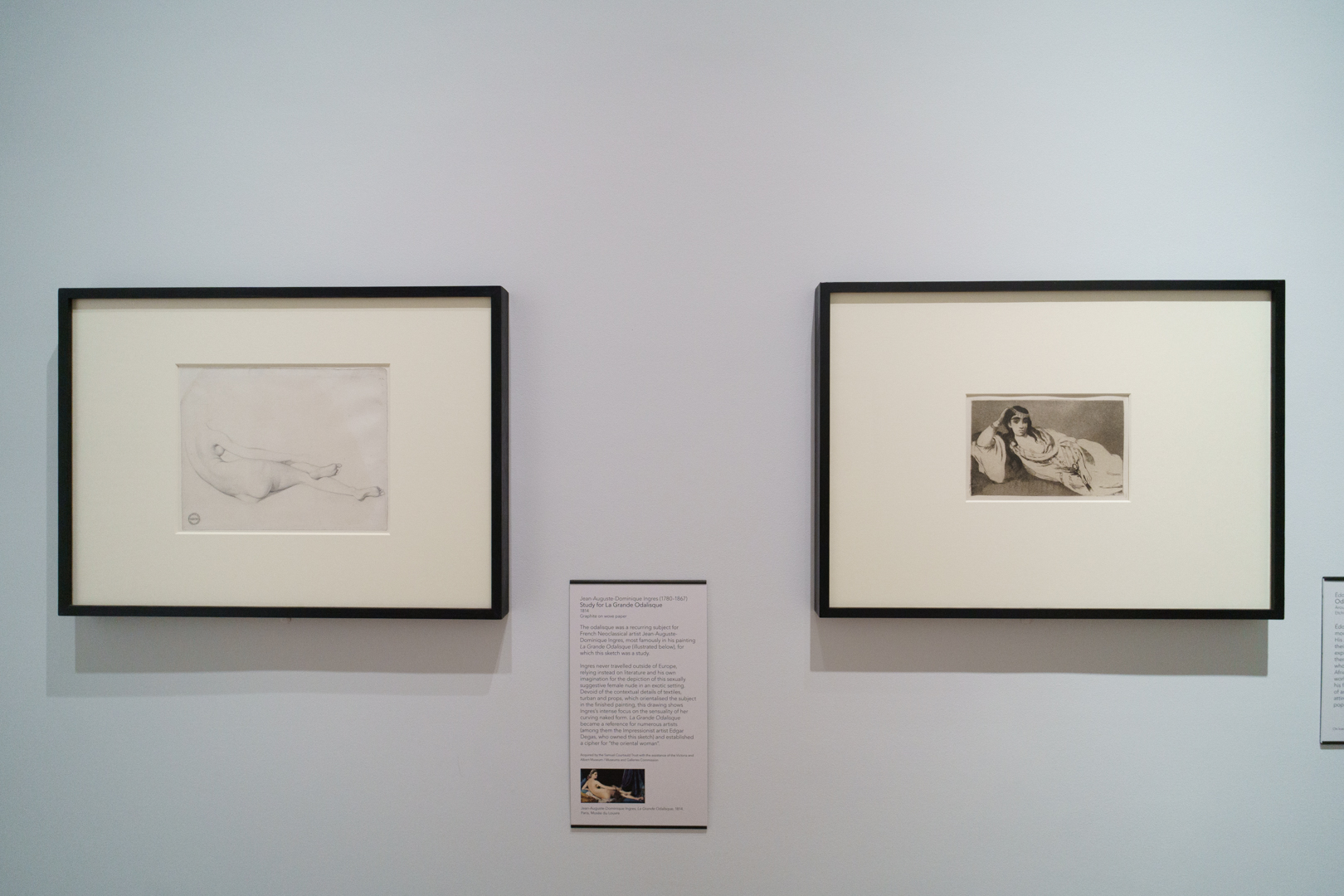 The section focusing on the fictional odalisque was especially fascinating for me. This stereotypical conception of a sexually-submissive, exotically-dressed female in a harem was a false idea that gripped the 19th-century artistic imagination, as shown here by Alexandre-Gabriel Decamps. On display is the Courtauld’s graphite study for Jean-Auguste-Dominique Ingres’ La Grande Odalisque (Louvre, Paris), arguably the most iconic picture of this subject. Shown alongside is Manet’s etching with aquatint of the same subject. Neither artist had travelled outside of Europe.
