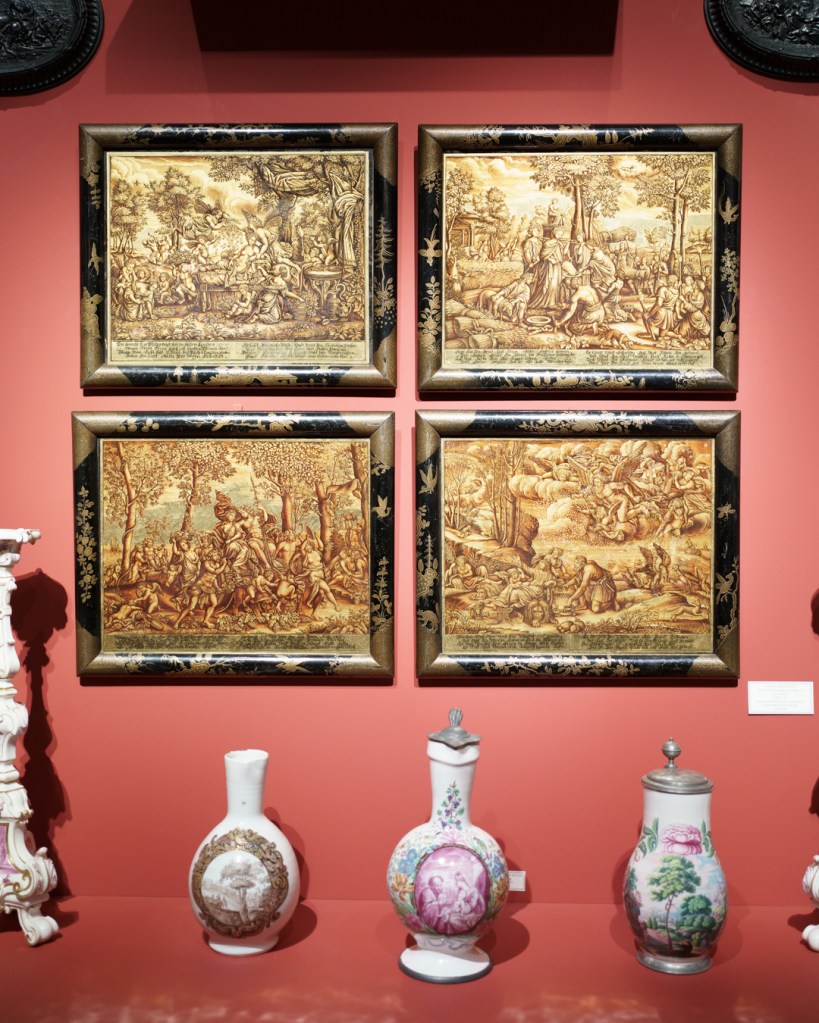 The designs are taken from a set of four engravings of the Seasons by Jean de Poilly, after the paintings by Pierre Mignard made for the decoration of the Château de Saint Cloud between 1677 and 1680.