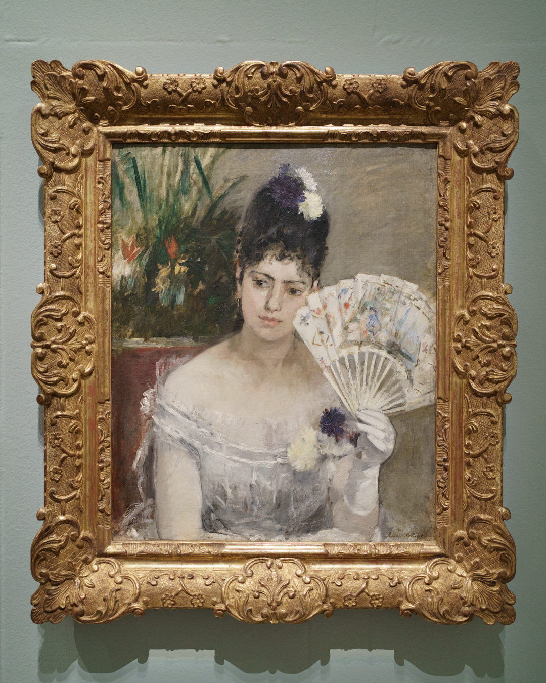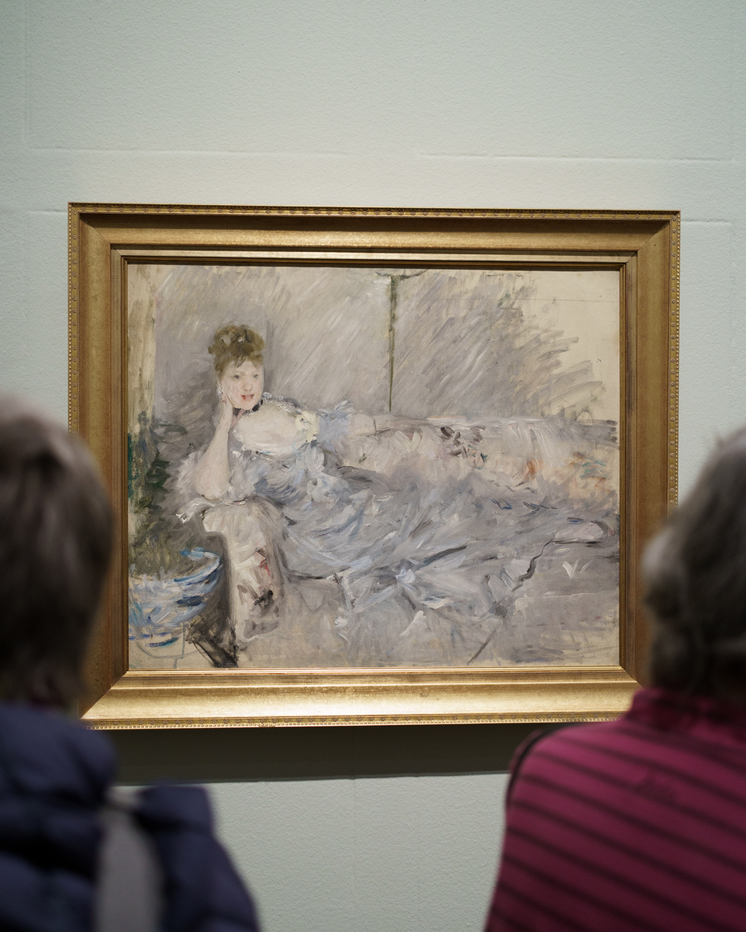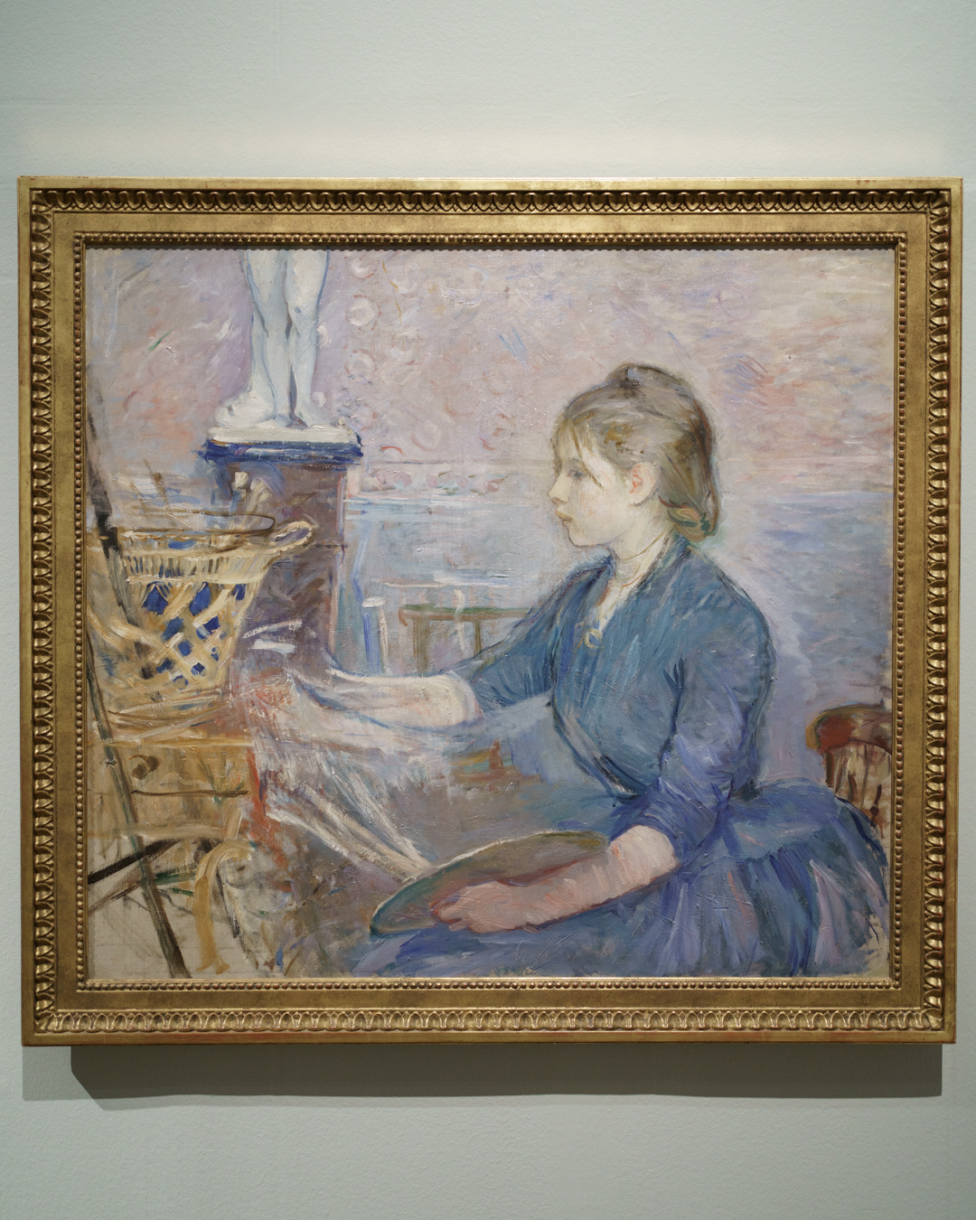 Although Morisot frequently made domestic scenes and portraits of her family and friends, her inspirations were broad and effective, embracing the visual tropes of high society portraiture expounded by Jean-Honoré Fragonard, Joshua Reynolds, and George Romney. A particularly strong comparison pertains to an Antoine Watteau fête galantes juxtaposed with a rear view of Morisot’s sister Edma (an example of her own painting is also exceptionally included in the show).