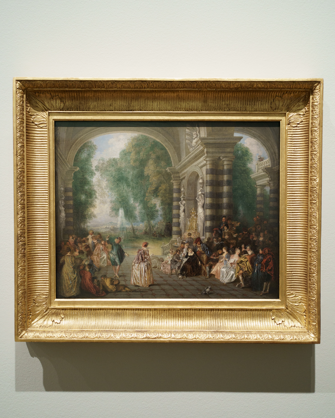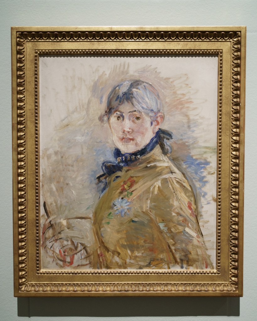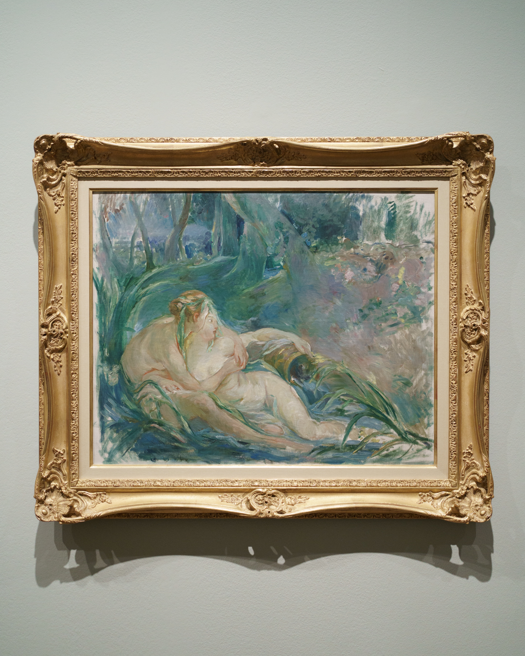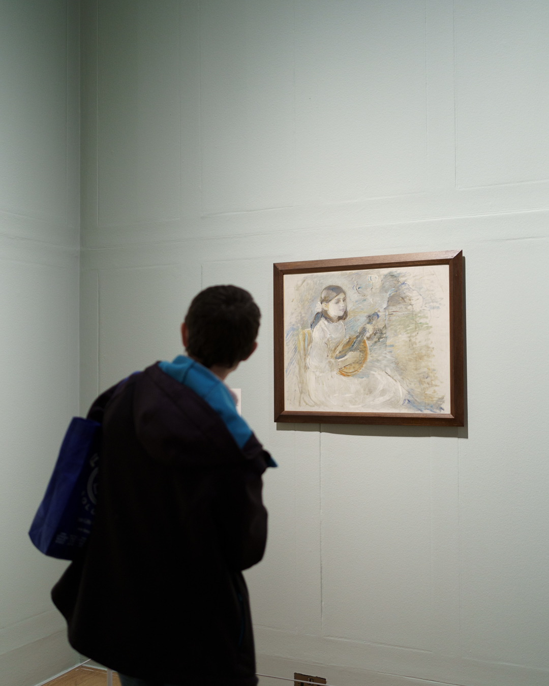 Although Morisot frequently made domestic scenes and portraits of her family and friends, her inspirations were broad and effective, embracing the visual tropes of high society portraiture expounded by Jean-Honoré Fragonard, Joshua Reynolds, and George Romney. A particularly strong comparison pertains to an Antoine Watteau fête galantes juxtaposed with a rear view of Morisot’s sister Edma (an example of her own painting is also exceptionally included in the show).