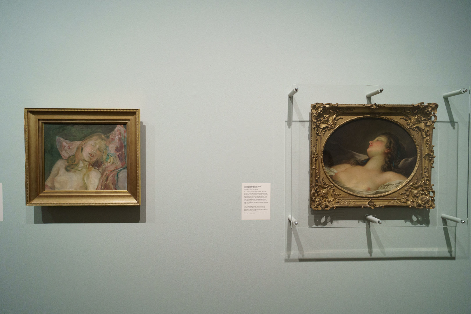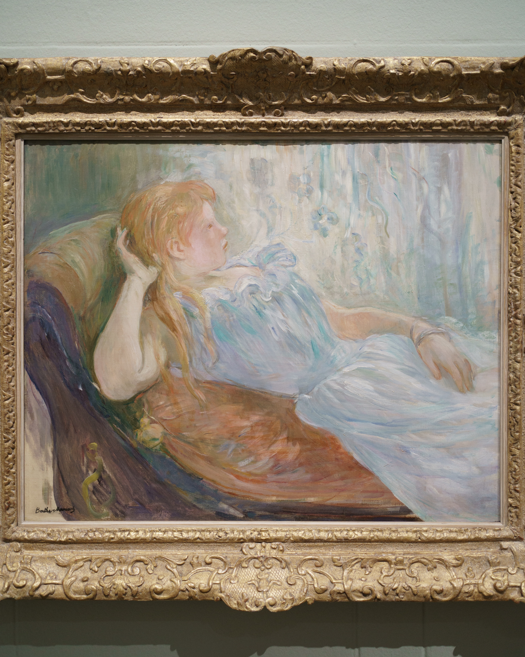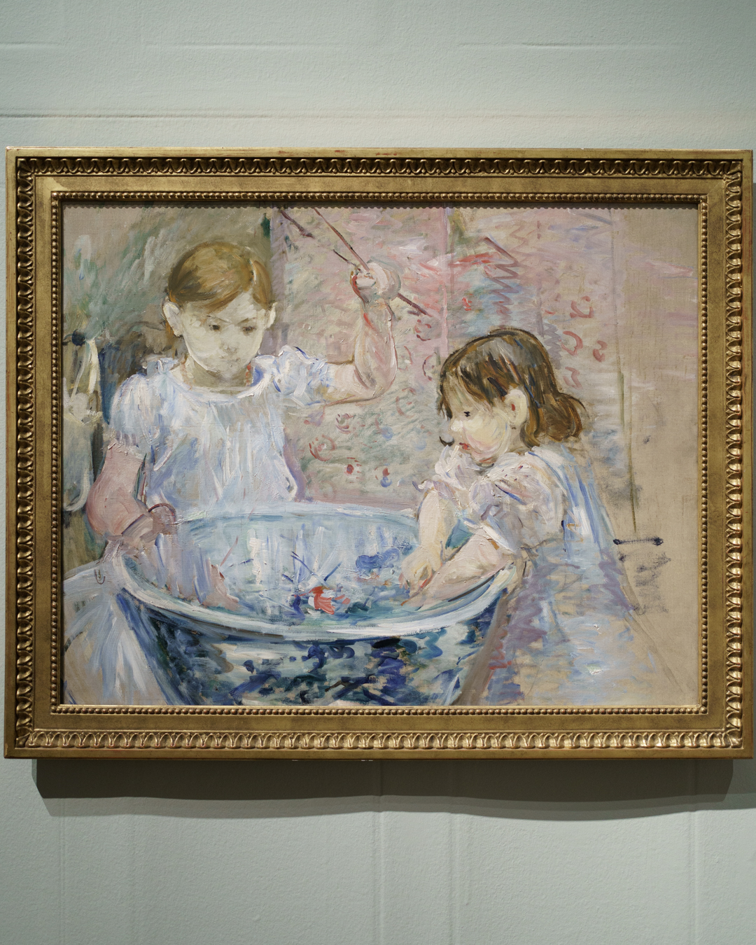 The fusion of these influences creates in Morisot’s paintings an incredible sense of directness from the sitter, splendid attire that is lavish and tactile, and delightful interactivity between multiple sitters, especially children like her daughter Julie. Seeing the decorated fan Morisot owned in front of an eloquent portrait featuring said fan was extremely satisfying. Furthermore, her partial copies of François Boucher’s ceiling works retain a delightful sweetness that animates her figures in ways the originals do not.