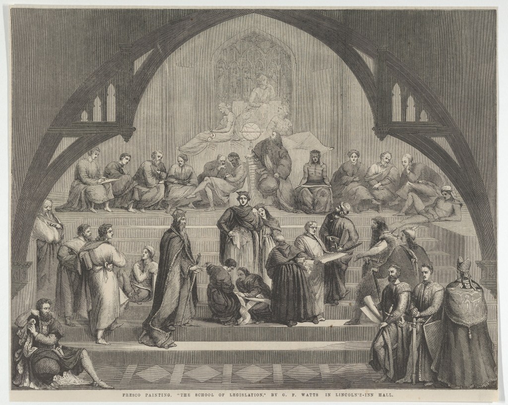 Recently, I finally had the chance to view George Frederic Watts’ huge fresco in the Great Hall of Lincoln’s Inn, open just once a year as part of the Open House Festival. The estate is home to the Honourable Society of Lincoln’s Inn which provides training for future barristers and maintains its existing community of legal professionals.
