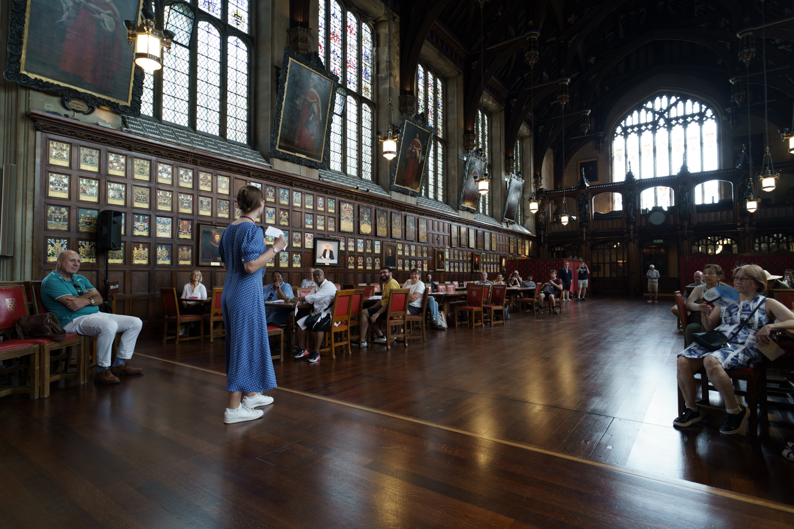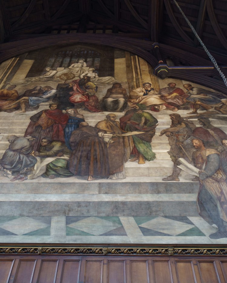 Situated on the north wall, Justice: A Hemicycle of Lawgivers (completed October 1859) served as a perspectival extension to the Tudor-inspired hall (built 1843-45), and also as a conduit to the past. The hall evokes the one in Hampton Court Palace and still functions as the Society’s dining area.