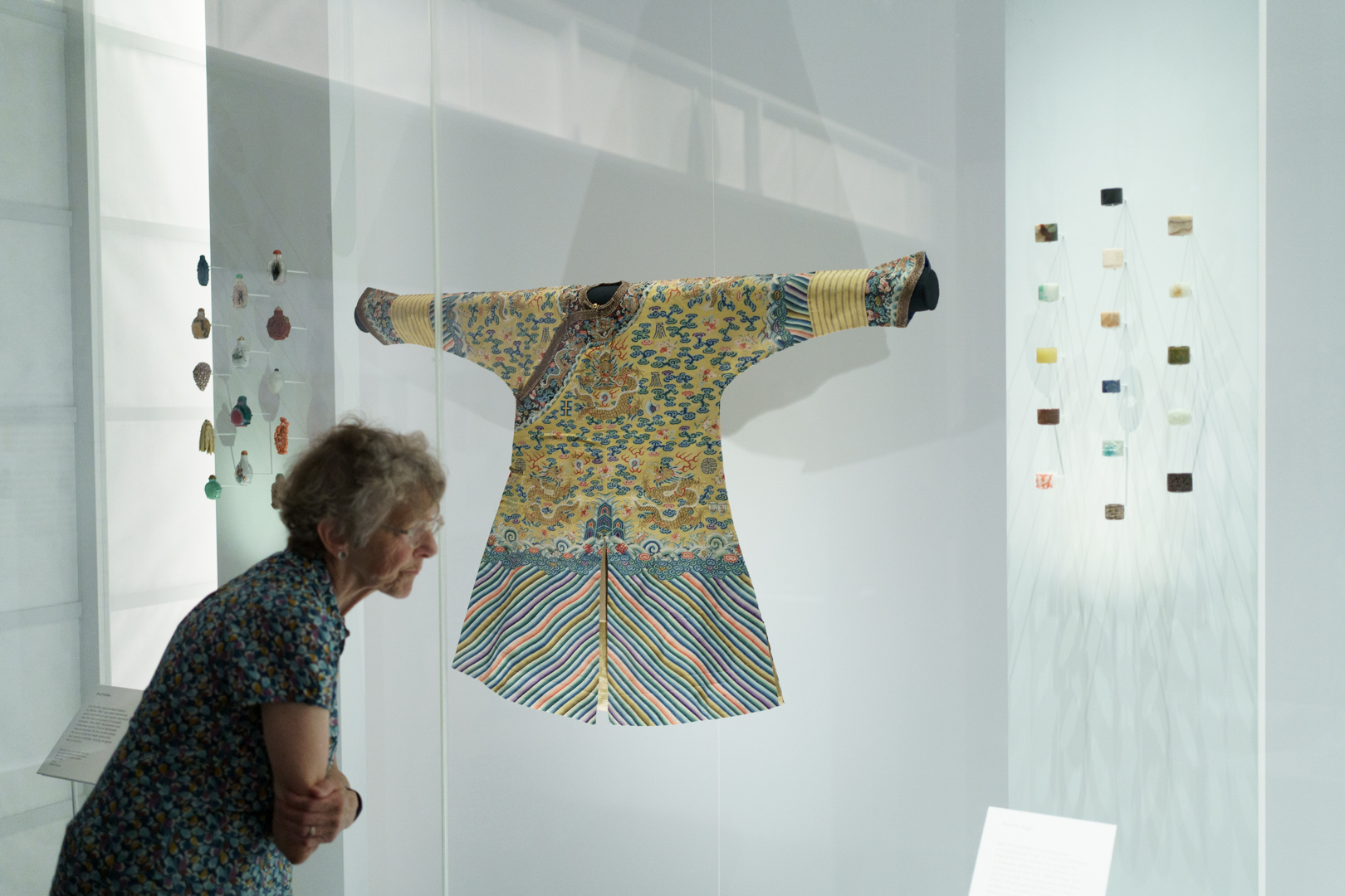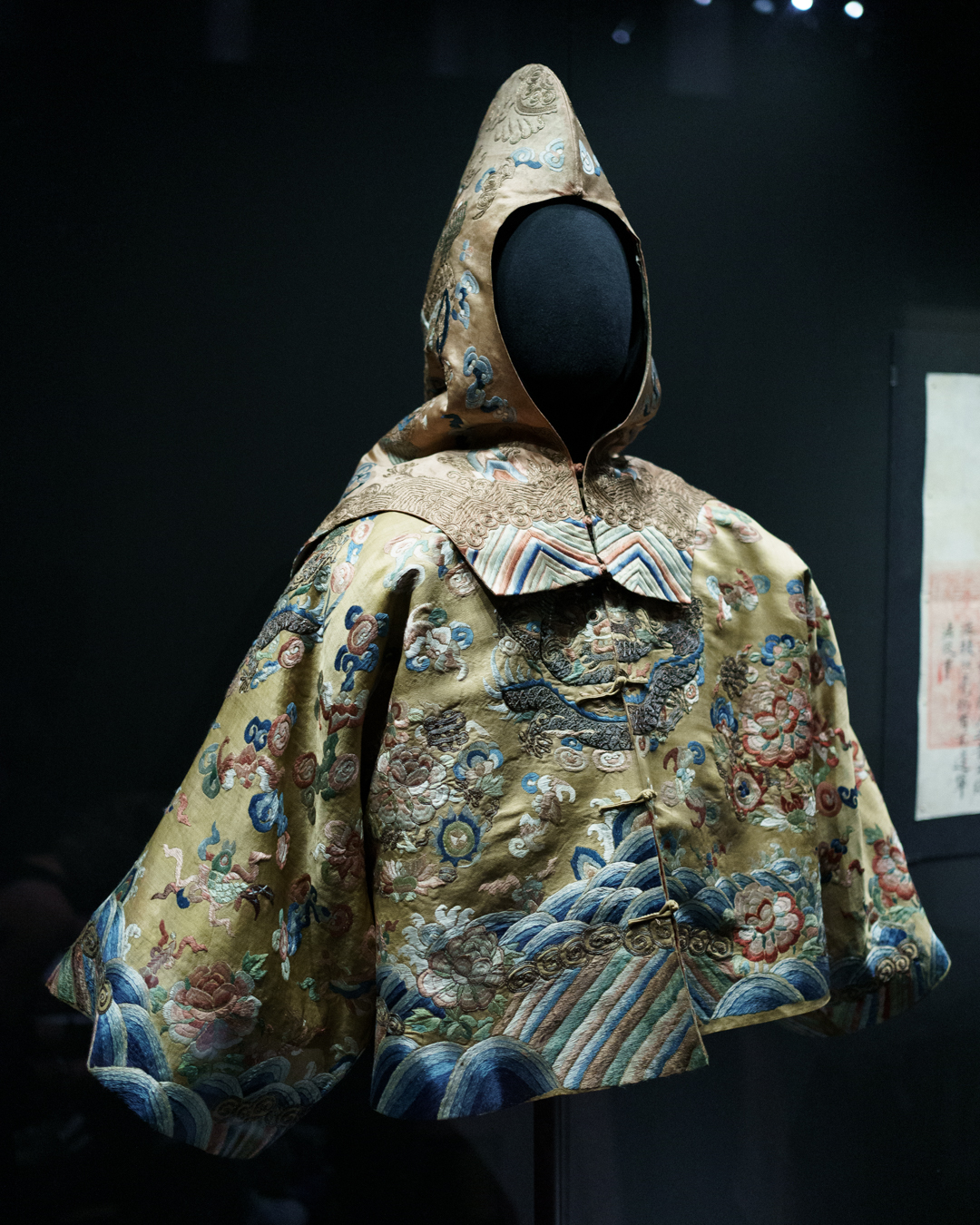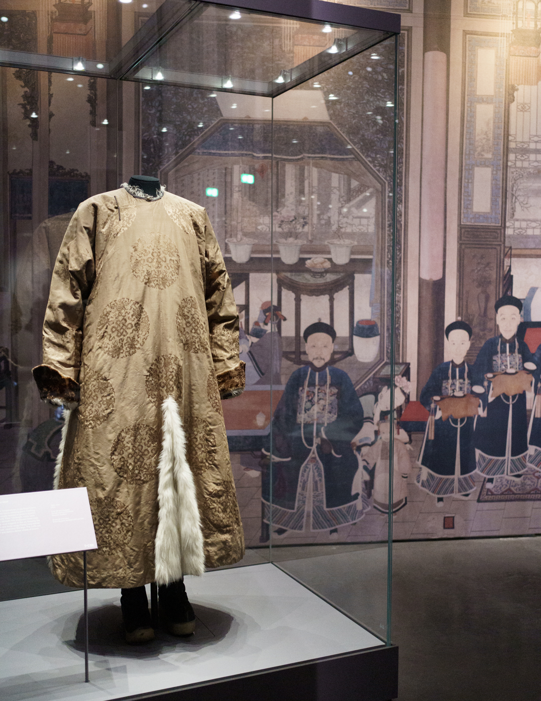 Gracing the entrance, a large blue map of the Eastern Hemisphere showing the vast territory of the Qing empire and a Manchu-Chinese imperial scroll conferring titles. Nearby, a map of Beijing and the Forbidden City guides us into the opulent lifestyles within the court. Imperial robes, including one made for the Empress Dowager Cixi (慈禧太后), hang next to fine accessories, porcelain, furniture, even an opera set, and two huge vases on loan from Buckingham Palace.