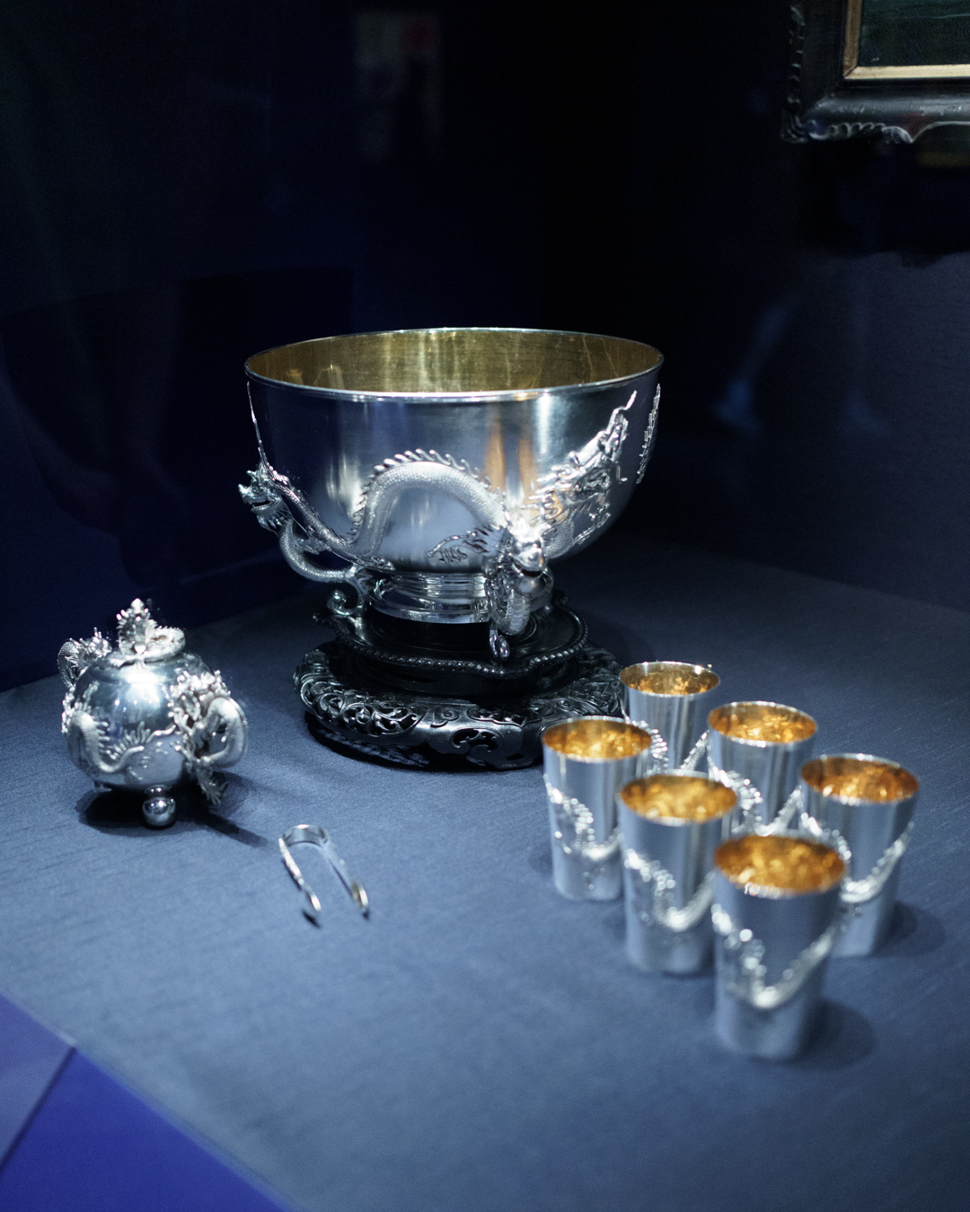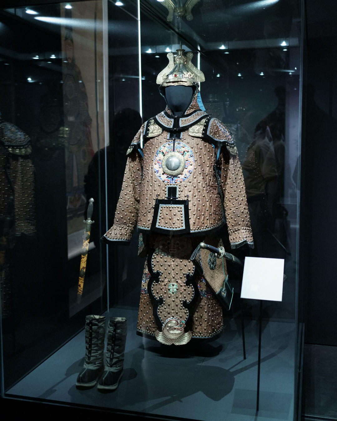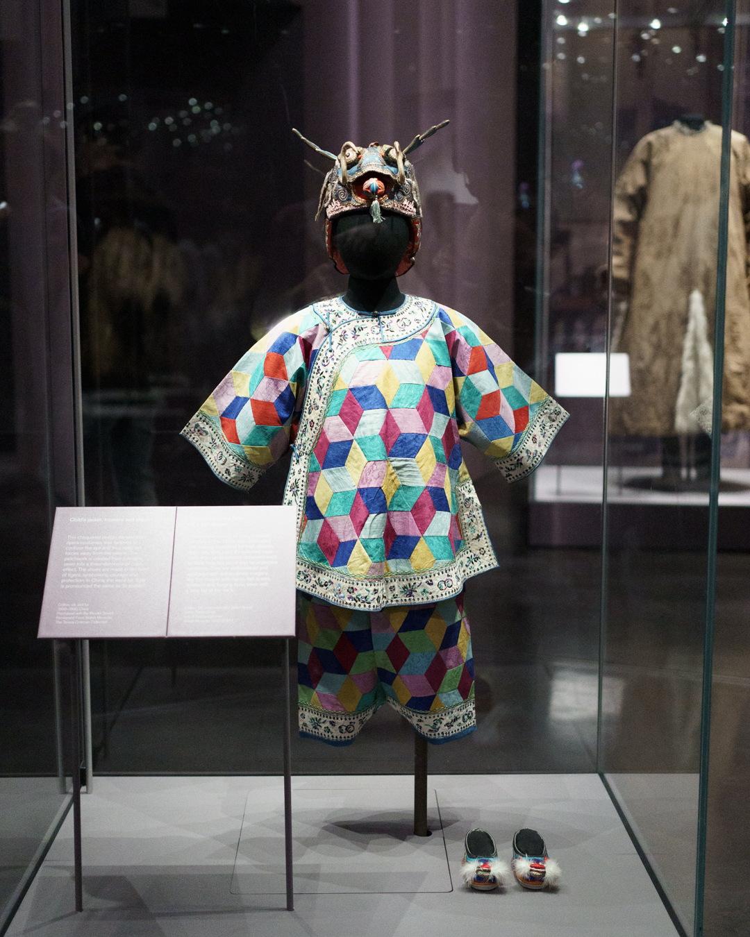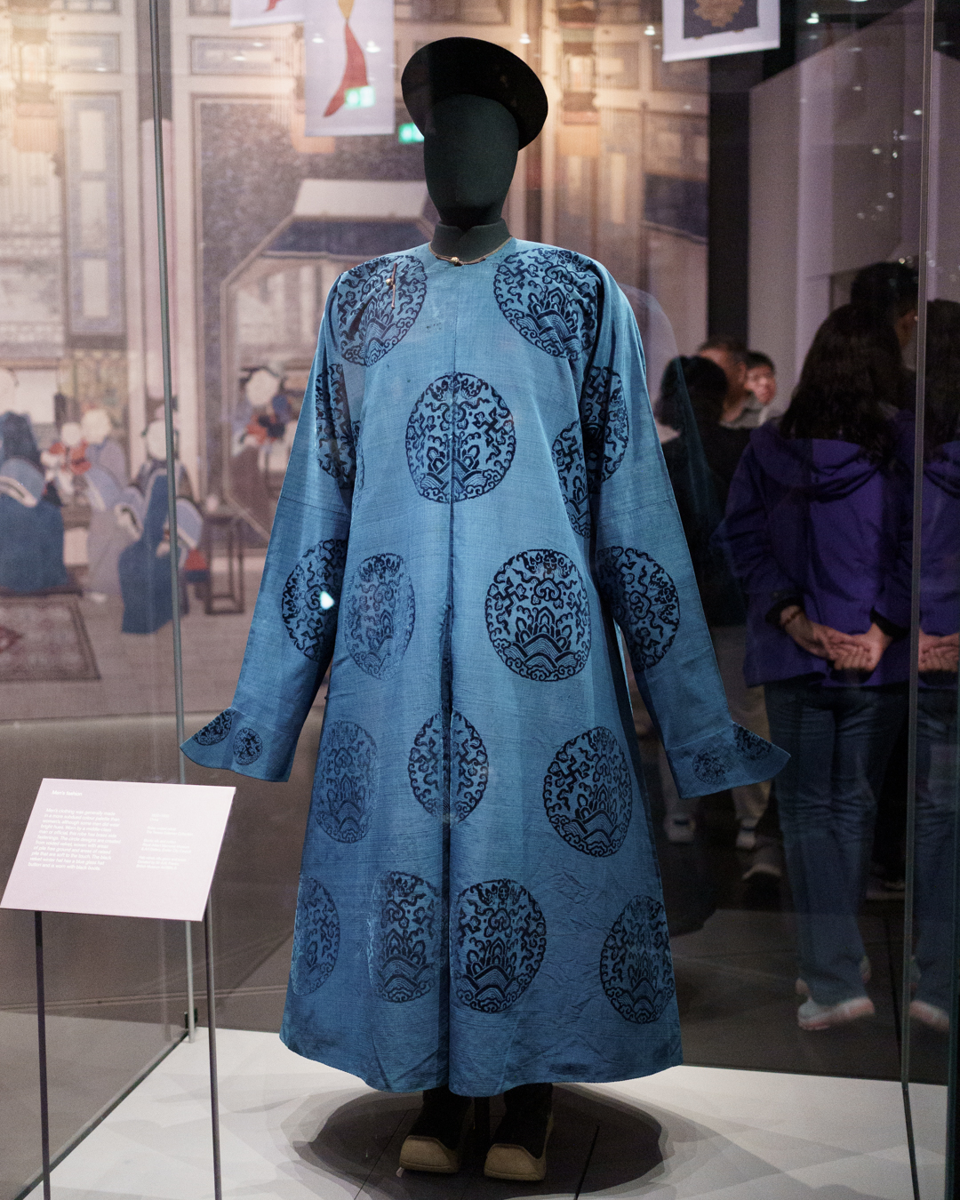Gracing the entrance, a large blue map of the Eastern Hemisphere showing the vast territory of the Qing empire and a Manchu-Chinese imperial scroll conferring titles. Nearby, a map of Beijing and the Forbidden City guides us into the opulent lifestyles within the court. Imperial robes, including one made for the Empress Dowager Cixi (慈禧太后), hang next to fine accessories, porcelain, furniture, even an opera set, and two huge vases on loan from Buckingham Palace.
