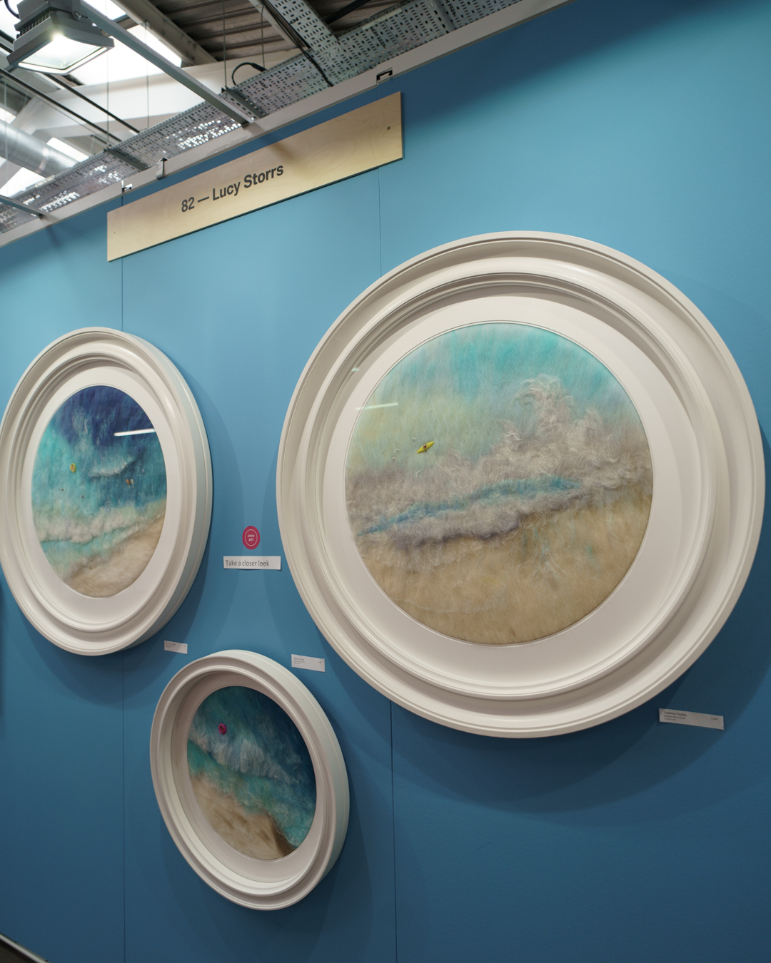 I was very impressed by Lucy Storrs‘ choice of medium for her birds-eye views of coastal scenes: sheep’s wool. It’s amazing how well the fibres create dynamism and flow in each image (@lucystorrsart, stand 82).
