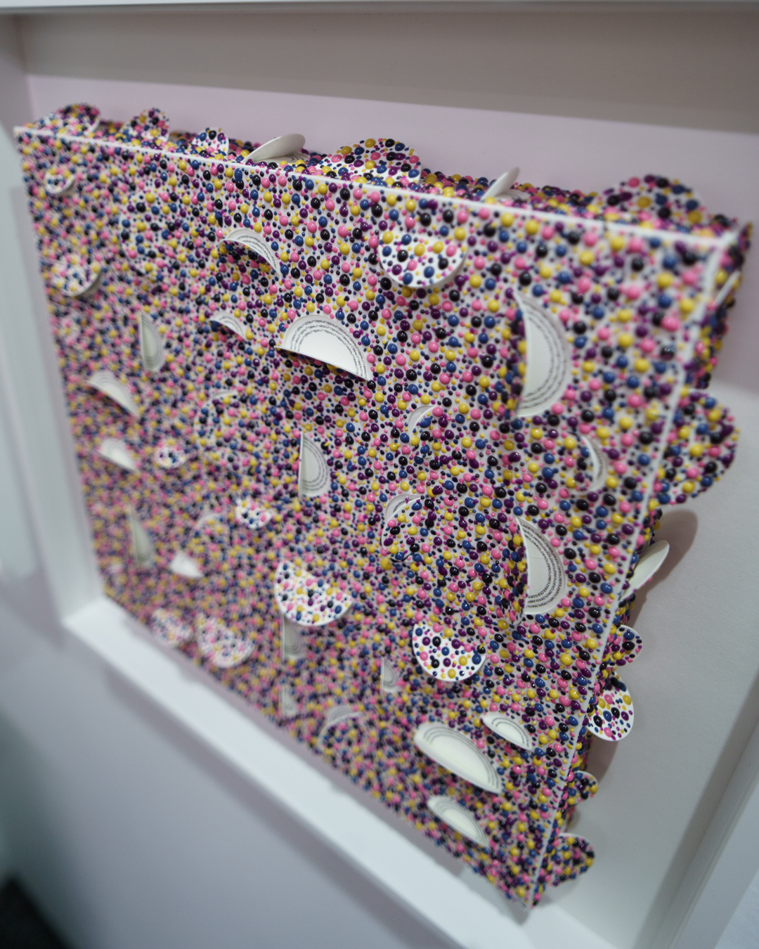 Taya De La Cruz‘s boxy creations must be seen in person, contrasting themes of inner and outer beauty using miniature handwritten texts and tactile dots! (@handwrittenart, stand 140)