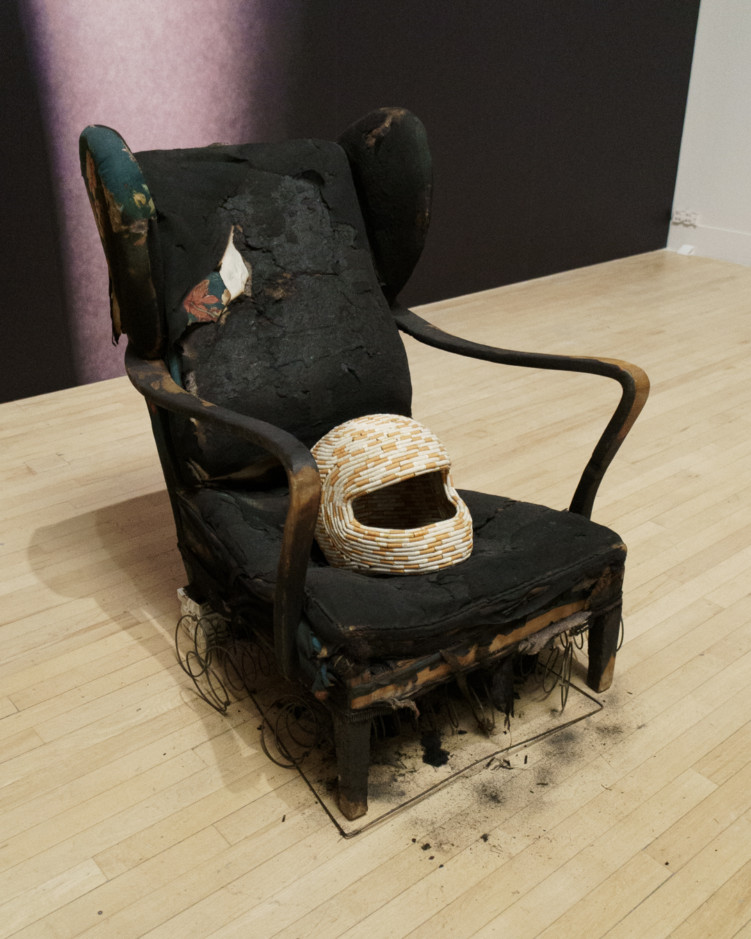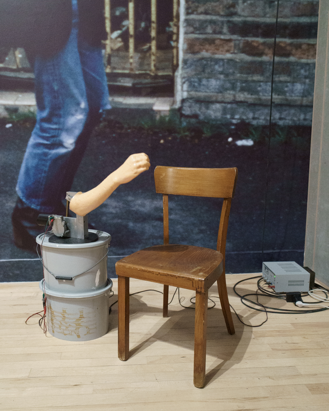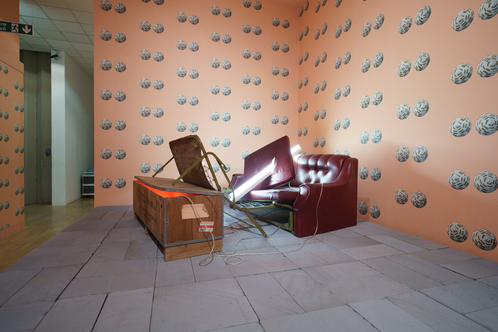 For the most part, Lucas’ works are fairly transparent and it’s not necessary to read too much into them. An appreciation for puns, however, is mandatory, like seeing a cigarette butt projecting out of one’s butt. Chairs remain a core theme in her practice, reworking their multi-faceted functions and evocation of a bodily presence; there is one skewered by fluorescent lights which a visitor related to images of St Sebastian.